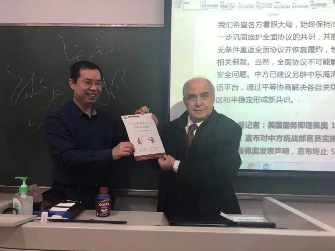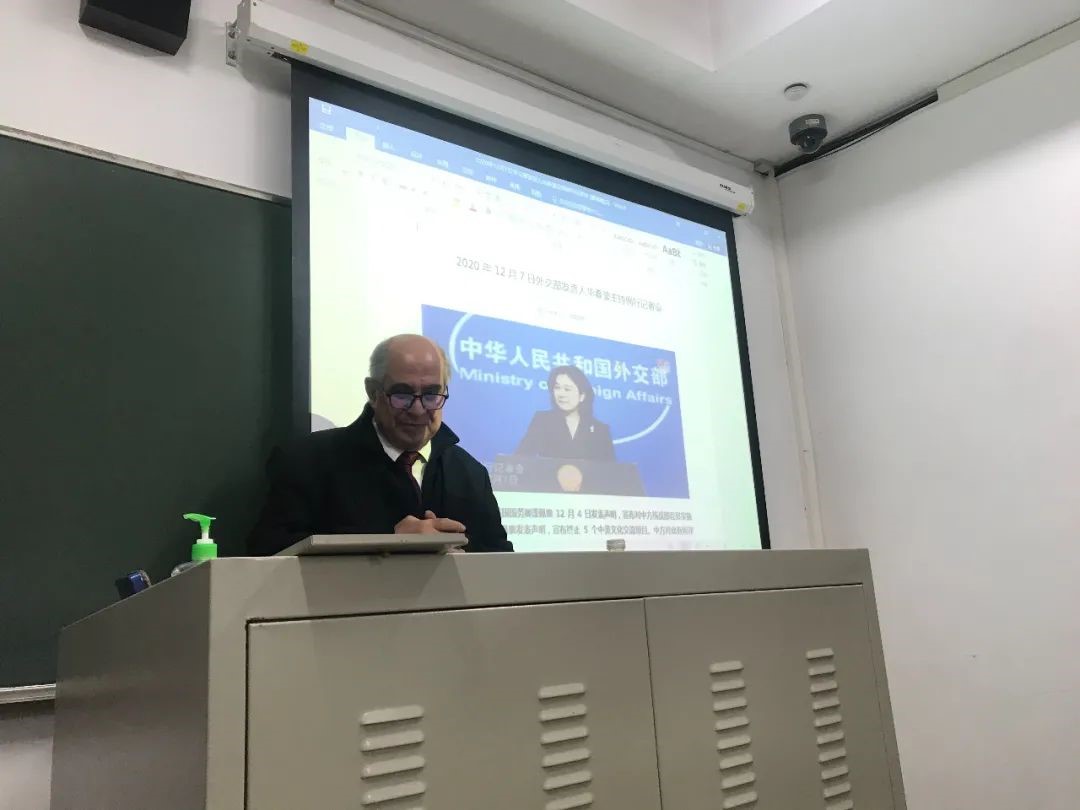 2020年12月9日上午,乐动在线中国官方网站阿拉伯语系课程集群思政进课堂系列讲座邀请了阿拉伯信息中心主任、曾任教于北京大学阿拉伯语系的前巴勒斯坦驻华大使穆斯塔法•萨法里尼先生来到教室为同学们讲课。本次讲座由阿拉伯语系袁琳老师主持,林丰民教授评议。