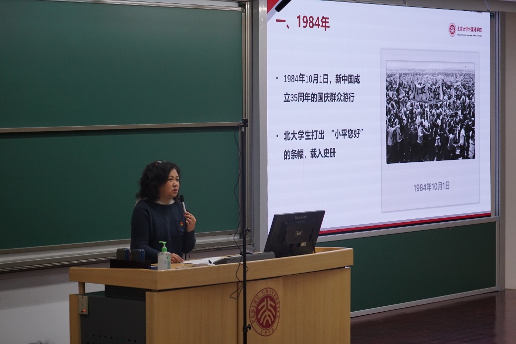 李淑静首先和同学们分享了自己在党的领导下、在北大求学和工作的故事。从18岁时参加国庆35周年庆典,与同学们一起喊出“小平您好”的口号,到多次经历党和国家发展过程中的重大时刻、多次参与重大活动,她娓娓道来,为同学们讲授了她作为一名党员的成长故事和心路历程。她表示,自己在北大求学、工作和成长的经历与党和国家走过的发展道路是紧密联系的。新时代青年的成长成才同样与时代密不可分,同时也肩负着实现中华民族伟大复兴的更为艰巨的时代使命。