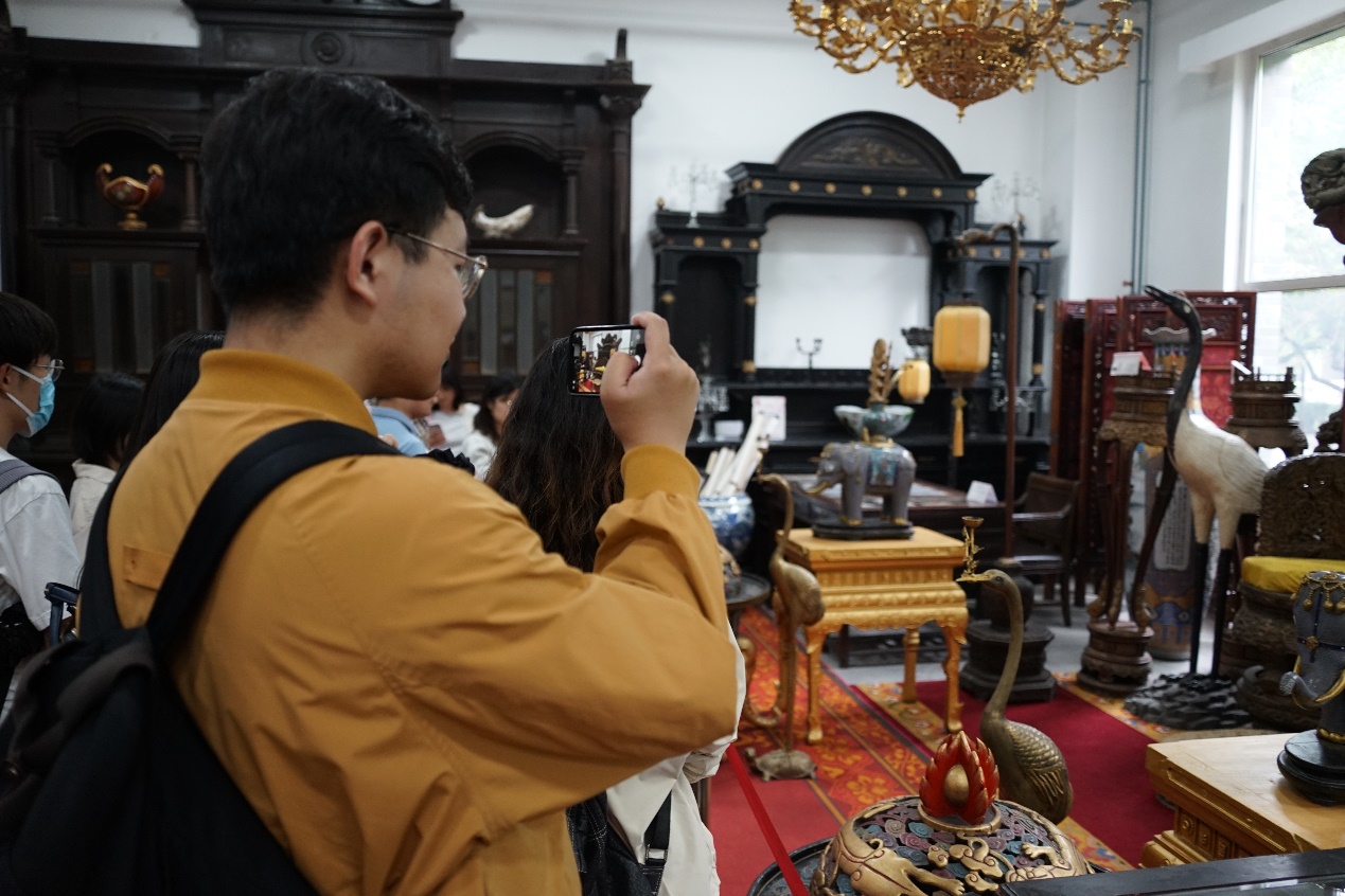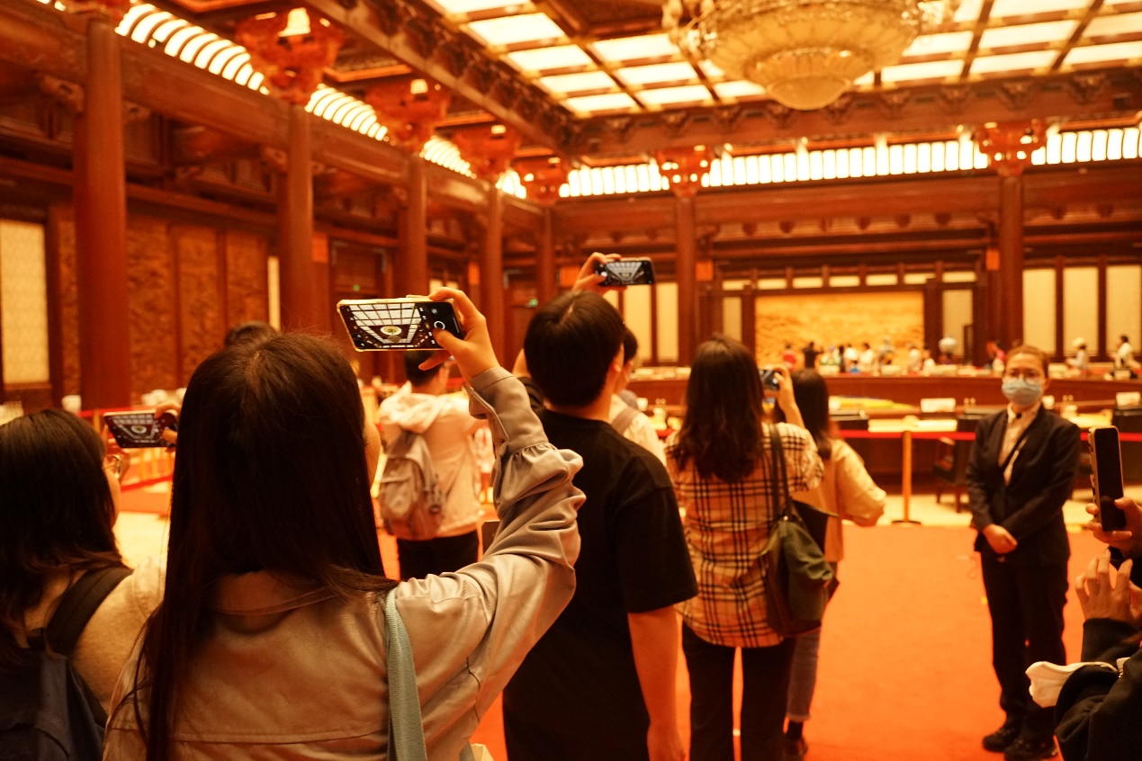 随后,实践团赴“会都”——北京雁栖湖国际会展中心参观。雁栖湖国际会议中心曾承办2014年APEC峰会以及首届与第二届“一带一路”国际合作高峰论坛圆桌峰会。师生一行跟随讲解员参观集贤厅,聆听讲解员讲解集贤厅室内设计的点滴思考与幕后故事,通过室内装潢与陈设,亲身感受峰会盛况。置身集贤厅内,汉唐气象与明清气派并举,古色古香与现代风格交融,融通古今,博雅东西,共同构成我国外交接待空间与国家礼仪空间的新地标,迸发出现代中国的文化自信与壮阔气势。建筑之美彰显人文之美,实践团师生在通过视觉、听觉近距离感受中国传统建筑的文化底蕴与艺术魅力的同时,也愈发坚定行语言专业所长、做文化交流使者的决心。国际盛事与大国外交呼唤扎根本土、放眼世界的复合型语言人才,外国语学院师生大有可为也必将大有作为。