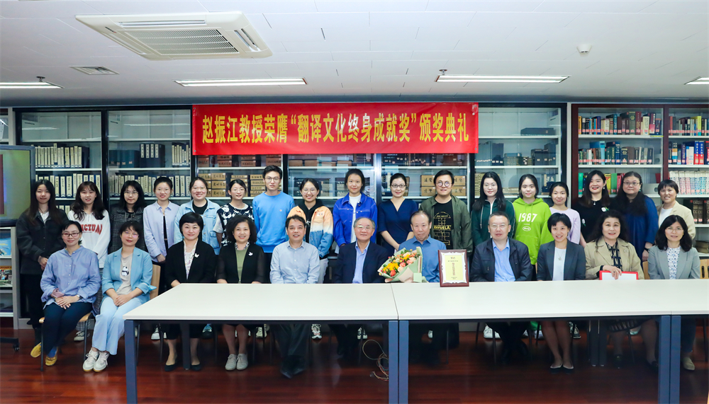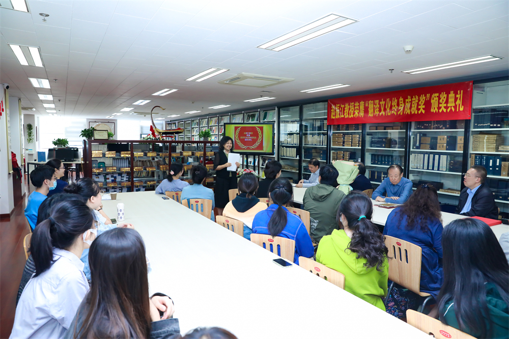 中国翻译协会第八次会员代表大会于今年4月1日在北京举行,会上举行了“翻译文化终身成就奖”表彰活动,外国语学院西班牙语专业教授、博士生导师、资深翻译家赵振江荣膺代表我国翻译界最高荣誉的翻译文化终身成就奖。2022年9月23日上午,中国翻译协会常务副会长,中国外文局原副局长王刚毅专程来到北京大学,为赵振江教授颁奖。赵振江教授、外国语学院党委书记李淑静、外国语学院院长陈明、副院长吴杰伟、副院长王丹、西葡意语系主任范晔、副主任于施洋及西葡意语系西班牙语专业师生出席了颁奖典礼。