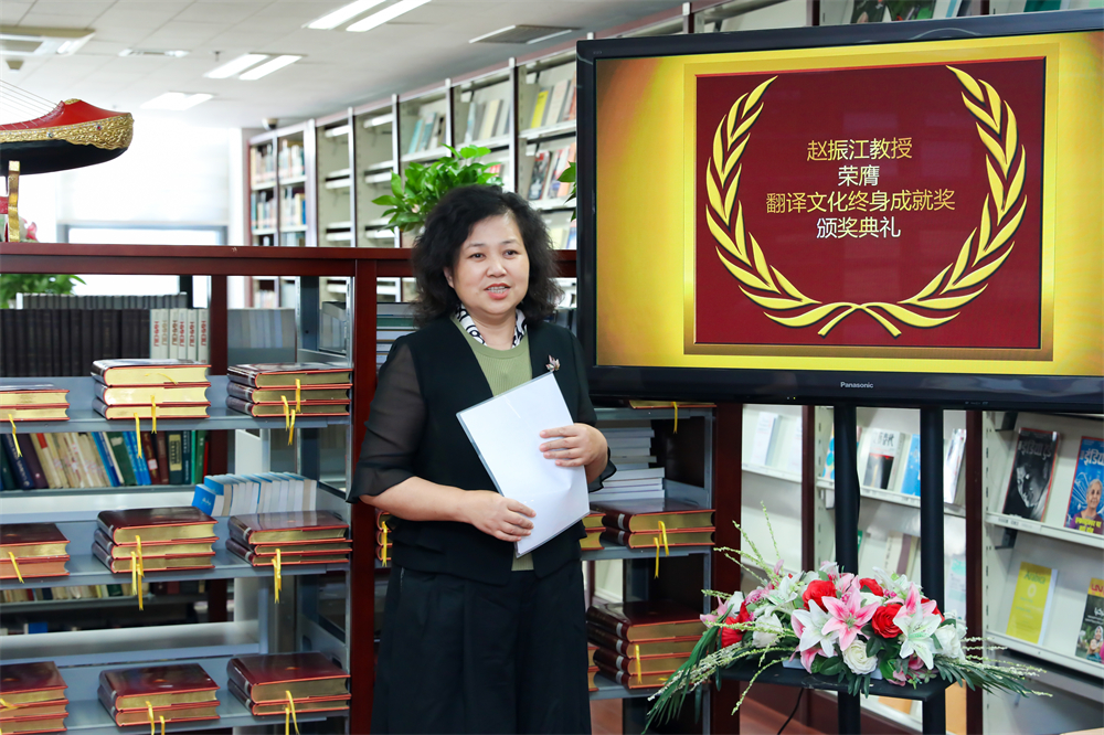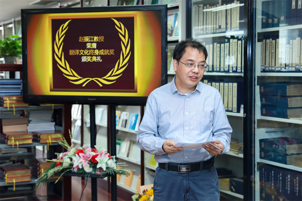 典礼由外国语学院党委书记李淑静教授主持。中国翻译协会常务副会长王刚毅首先致辞。他指出,2006年,中国翻译协会设立翻译文化终身成就奖,授予健在的、在翻译与对外文化传播和文化交流方面做出杰出贡献,成就卓著、影响广泛、德高望重的翻译家,是中国翻译协会设立的表彰翻译家个人的最高荣誉奖项。奖项设立以来,共有38位德高望重的翻译家获奖,其中有4位来自北大,他们是大家熟悉的季羡林先生、许渊冲先生、仲跻昆先生,当然还有今天获奖的赵振江先生。这些翻译大家为增进中国人民和世界其它国家人民之间的了解和友谊架起了桥梁,为我国社会进步和国家发展做出了重要贡献。中国翻译协会开展此项表彰活动,是对他们的渊博学识和突出贡献的高度评价和充分认可,是对他们严谨认真的敬业精神、辛勤耕耘的奉献精神和恪尽职守的职业道德的大力弘扬,对于鼓励我国广大中青年翻译工作者向老一代翻译家学习,继承和发扬他们的优良传统,提高自身的业务素质,繁荣我国的翻译事业具有深远的意义。王刚毅先生还强调中国翻译协会致力于对外宣介习近平新时代中国特色社会主义思想,努力构建融通中外的话语体系和叙事体系,同时积极团结翻译界各方面力量,推动中国翻译事业不断取得新的进展,在文化交流领域不断拓展新的空间。最后,他勉励在场的同学们继承和发扬北大外国文学翻译、研究的优秀传统,为我国对外文化交流事业贡献更多力量。