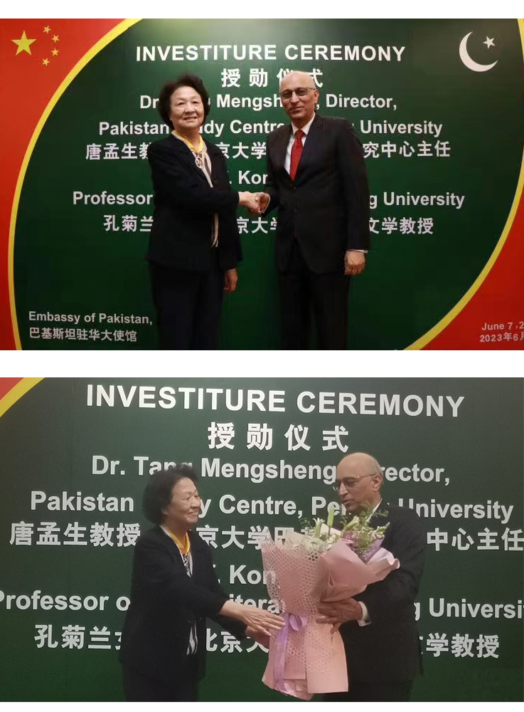 2023年6月7日,巴基斯坦驻华大使馆举办隆重仪式,授予乐动在线中国官方网站南亚学系唐孟生教授与孔菊兰教授巴基斯坦“卓越之星”勋章,以表彰两位学者在推动乌尔都语教学、增进两国人文交流、增进中巴友谊方面作出的重要贡献。巴基斯坦驻华大使莫因·哈克、政务参赞穆罕默德·卢曼·艾哈迈德、武官Ranna Faisal Rafiq准将、社会福利公使Ijaz Ahmad、科技公使Kamran Rasheed博士,以及原中国驻(巴基斯坦)卡拉奇总领事安启光、三峡集团财务总监王少峰等各界人士出席了授勋仪式。