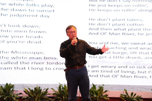 大学英语教研室黄必康老师演唱了百老汇史上最经典、最悠久的音乐剧《Showboat》中的歌曲《Old Man River》,黄老师用浑厚的歌声讲述了长流不息的密西西比河上的故事。
