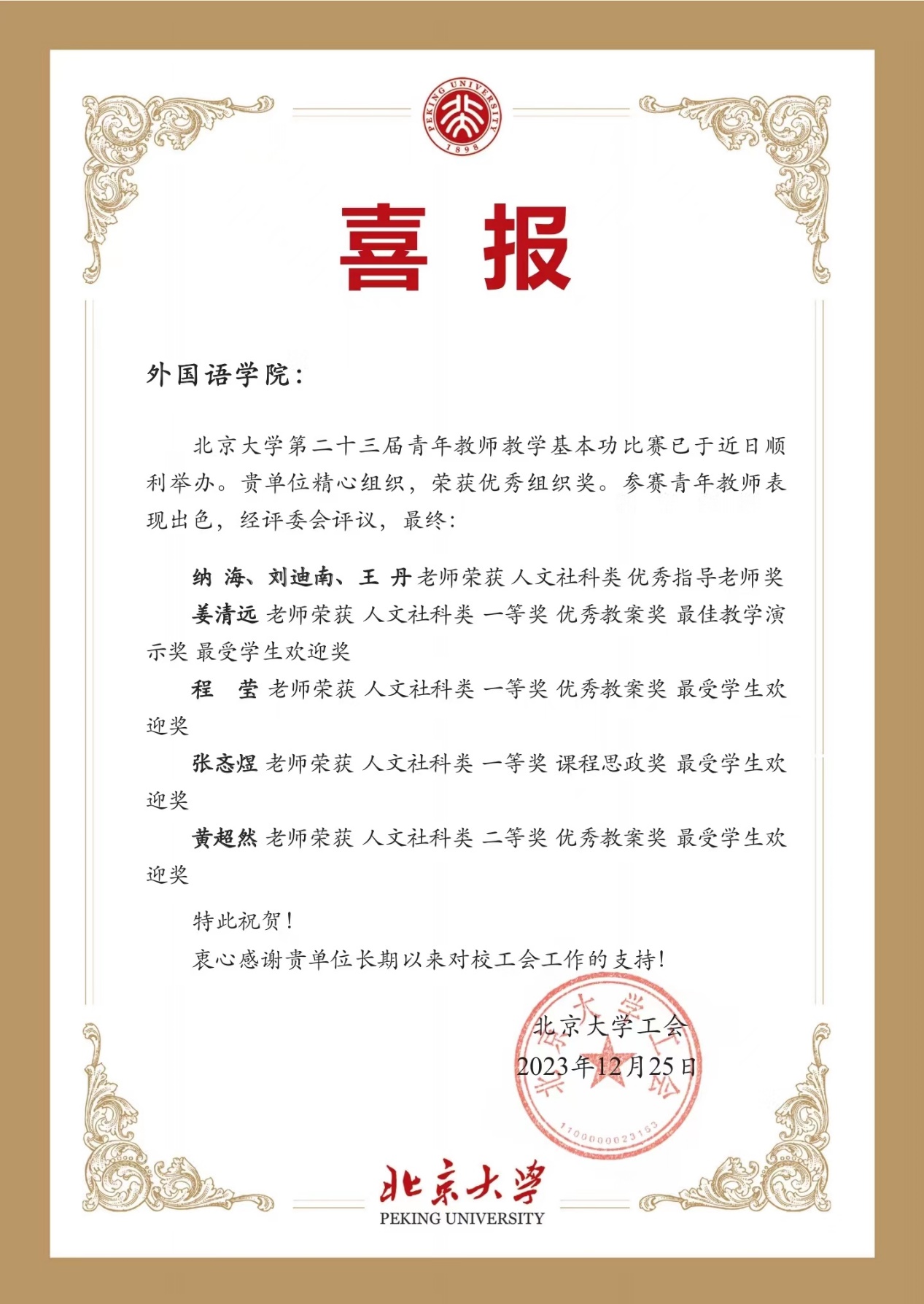 此外,英语系长聘副教授纳海、亚非系副教授刘迪南、朝(韩)语系教授王丹获人文社科类优秀指导教师奖;姜清远包揽人文社科类优秀教案奖、最佳教学演示奖、最受学生欢迎奖;张忞煜获人文社科类课程思政奖、最受学生欢迎奖;程莹、黄超然获人文社科类优秀教案奖、最受学生欢迎奖。