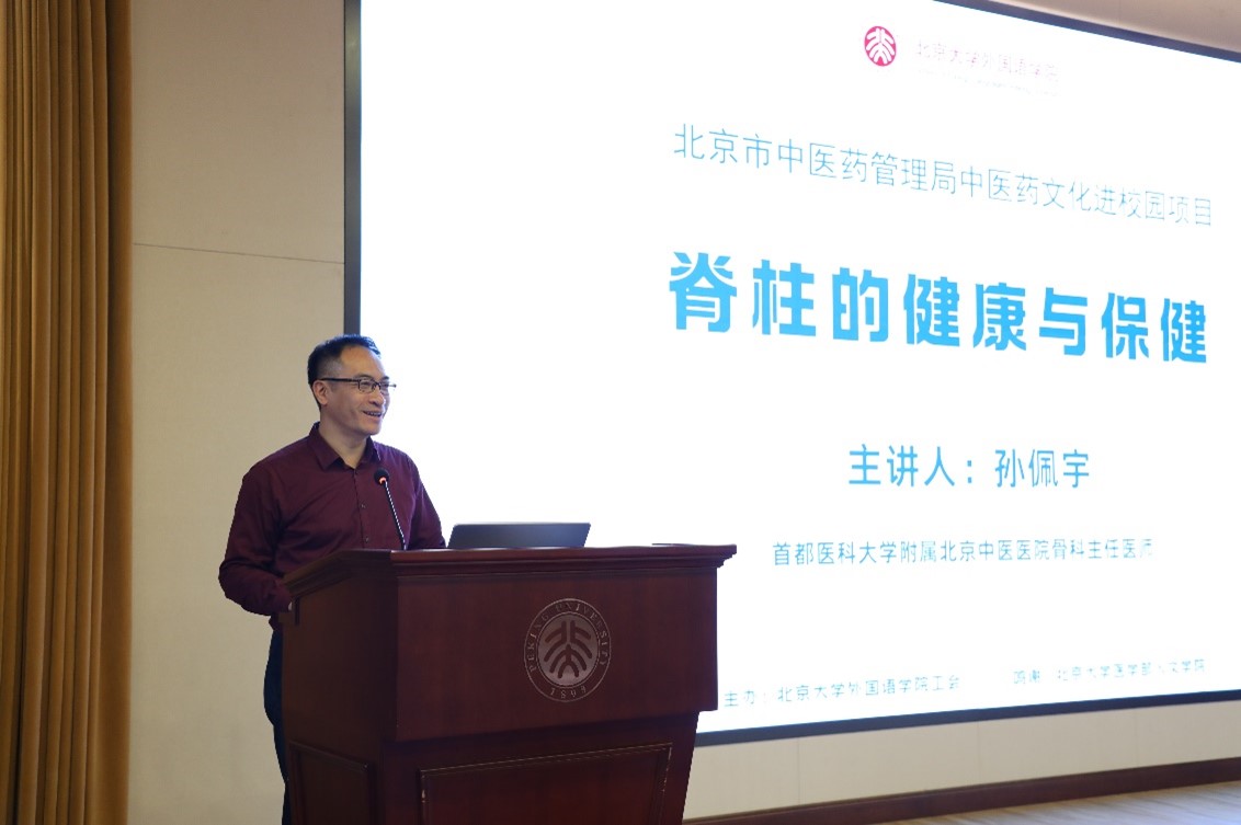 脊柱是人体的“顶梁柱”,是身体健康的根本。长时间伏案工作和学习,使教师和学生的颈椎、腰椎压力巨大。为了更好的保护脊柱,增强师生对脊柱健康的重视,作为“北京市中医院管理局中医药文化进校园”活动之一,11月20日外国语学院工会特别邀请骨科专家孙佩宇老师为大家带来题为“脊柱的健康与保健”的专题讲座,吸引了部分外院师生及校内老师前来聆听。讲座由外院工会常务副主席倪丽慧老师主持。