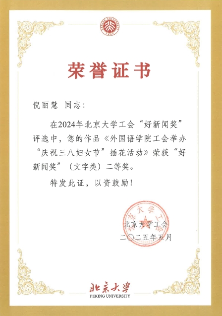 在2024年北京大学工会“好新闻奖”评选中,校工会特邀请专家评委,结合工会工作特点,从新闻题材、宣传效果、稿件可读性与写作规范、图片视觉冲击力及与主题切合度等方面,同时依据评奖通知要求,对参评稿件和图片进行了逐一评议,外国语学院倪丽慧《外国语学院工会举办“庆祝三八妇女节” 插花活动》荣获好新闻奖(文字类)二等奖;冯一帆《乐动在线中国官方网站举行2024年新春团拜会》荣获好新闻奖(文字类)二等奖;王乃懋《寻迹运河源, 感悟新理念一一外国语学院工会组织春游活动》和《外国语学院羽毛球队荣获2024年北京大学教职工羽毛球赛乙组季军》荣获好新闻奖(图片类)三等奖。