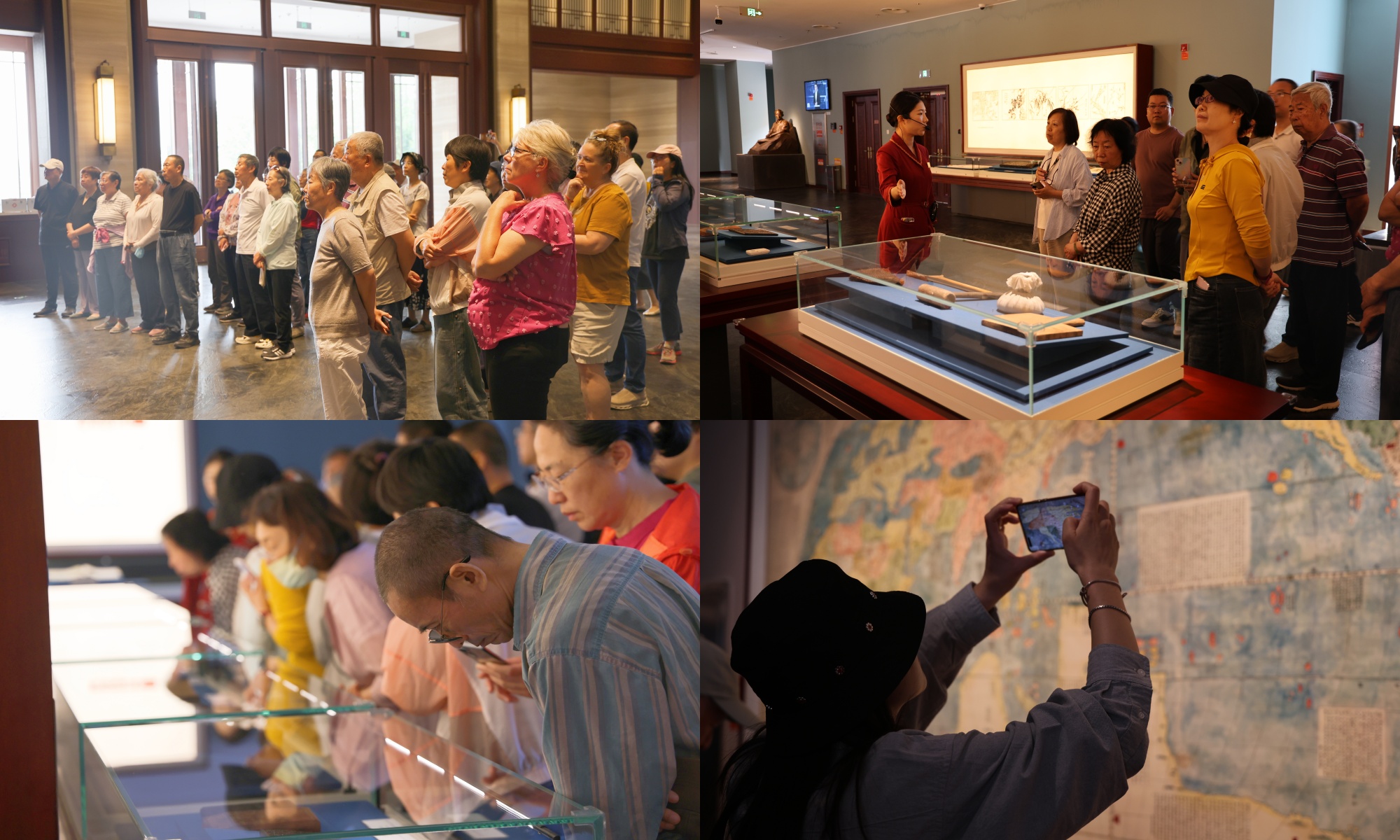 5月30日清晨,外国语学院工会的教职工们从燕园集体乘车抵达燕山脚下,走入中国国家版本馆总馆,掩映在山水园林中的馆藏厅阁典雅庄严。在文兴楼中,老师们在壮丽的壁画《山河揽胜》前合影留念。移步换景,在讲解员的带领下,教职工们依次走入文兴楼、文华堂、文瀚阁,分别参观了“版本工艺”“中国邮票”“中国货币”“斯文在兹——中华古代文明版本展”“真理之光——马克思主义中国化时代化经典版本展”“见证伟业——中华民族复兴版本展”等专题展览。
