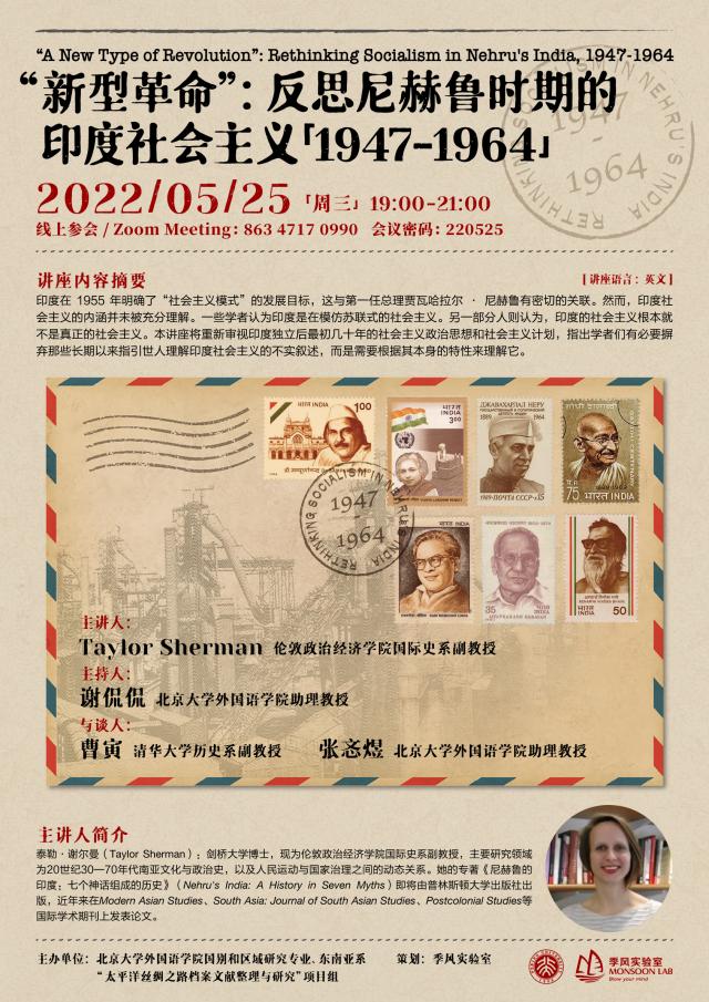 2022年5月25日晚,伦敦政治经济学院国际史系副教授泰勒· 谢尔曼(Taylor Sherman)应邀为我院师生进行了一场题为“‘新型革命’:反思尼赫鲁时期的印度社会主义,1947-1964”的线上讲座。本次讲座由乐动在线中国官方网站国别和区域研究专业、东南亚系和“太平洋丝绸之路档案文献整理与研究”项目组主办,乐动在线中国官方网站谢侃侃助理教授主持,清华大学历史系曹寅副教授和北大外院国别和区域研究专业张忞煜助理教授参与讨论。