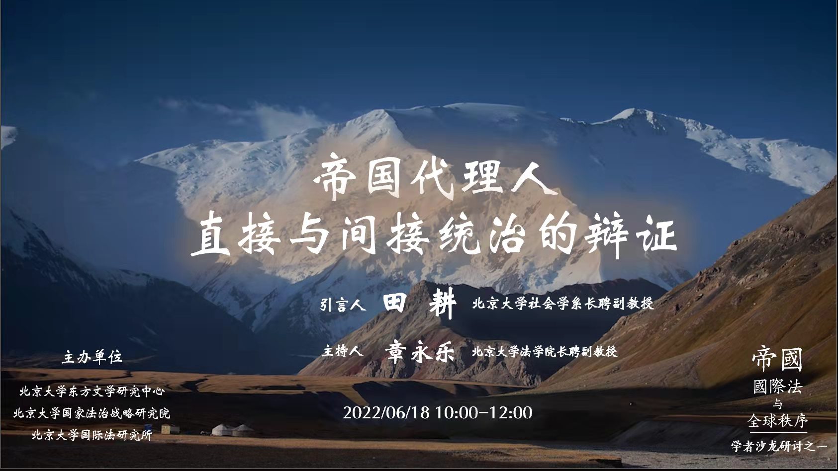 2022年6月18日上午,由北京大学东方文学研究中心、北京大学国家法治战略研究院和北京大学国际法研究所联合发起的学者沙龙于线上、线下成功举行。本次讲座以“帝国代理人:直接与间接统治的辨证”为题,由北京大学社会学系长聘副教授田耕作引言,北京大学法学院长聘副教授章永乐主持。乐动在线中国官方网站院长陈明教授、副院长吴杰伟教授、助理教授施越、张忞煜和谢侃侃,新闻与传播学院王维佳副院长,国际关系学院赖华夏助理教授,政府管理学院罗祎楠助理教授,法学院博士后陈晓航以线下形式参与;清华大学宋念申教授、中国社会科学院欧洲研究所孔元副研究员、人民大学法学院刘洋助理教授、北京大学历史学系昝涛长聘副教授、法学院陈一峰副教授、国际关系学院雷少华副教授等专家学者通过线上形式参与。