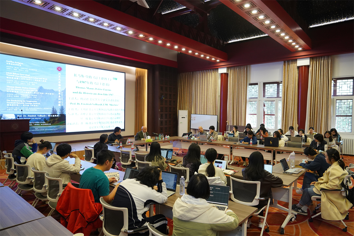 10月24日上午,第三场讲座“托马斯·曼《浮士德博士》与1587年的《浮士德书》”在外国语学院民主楼208会议室举行。讲座由北京大学德语系副主任毛明超老师主持,北京大学德语系黄燎宇老师和北京大学德语系罗炜老师担任与谈人。傅汉德教授指出,托马斯·曼在他的小说《浮士德博士》(Doktor Faustus)中大量援引了1587年出版的《浮士德书》(Historia),穿插并组合了宗教色彩的地名以及丢勒的画作等细节,将发生在20世纪的故事与宗教改革的时代相连结。随后,傅汉德教授分析了《浮士德博士》对《浮士德书》、路德《圣经》以及《痴儿西木传》等文本的指涉,将主人公莱韦屈恩与浮士德的形象联系在一起,并进一步把这种跨时空的关联性上升为德国文化的产物。而在另一方面,《浮士德博士》中频繁引用的古德语营造了一种“宗教氛围”,也暗示了主人公对16世纪浮士德的逐步认同。在与谈环节,罗炜老师肯定了傅汉德教授将德国上世纪的灾难与路德时代相关联的思路。黄燎宇老师谈到了托马斯·曼在德国文学领域的重要地位,然后就“德国为何陷入了灾难”这一问题提出了自己的观点,并论及音乐对于德国形象与德国历史发展的重要意义。