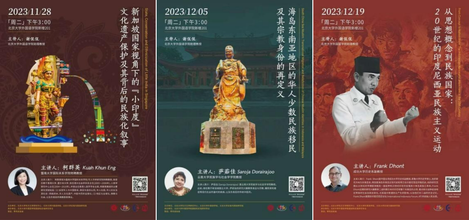 2023年11月至12月,外国语学院举办了三场由海外学者主讲的东南亚研究前沿讲座,主题分别为“新加坡国家视角下的‘小印度’:文化遗产保护及其背后的民族化叙事”、“海岛东南亚地区的华人少数民族移民及其宗教身份的再定义”、“从思想概念到民族国家:20世纪的印度尼西亚民族主义运动”。该讲座系列由北大东方文学研究中心、外国语学院和区域与国别研究院主办,外国语学院国别和区域研究专业承办。