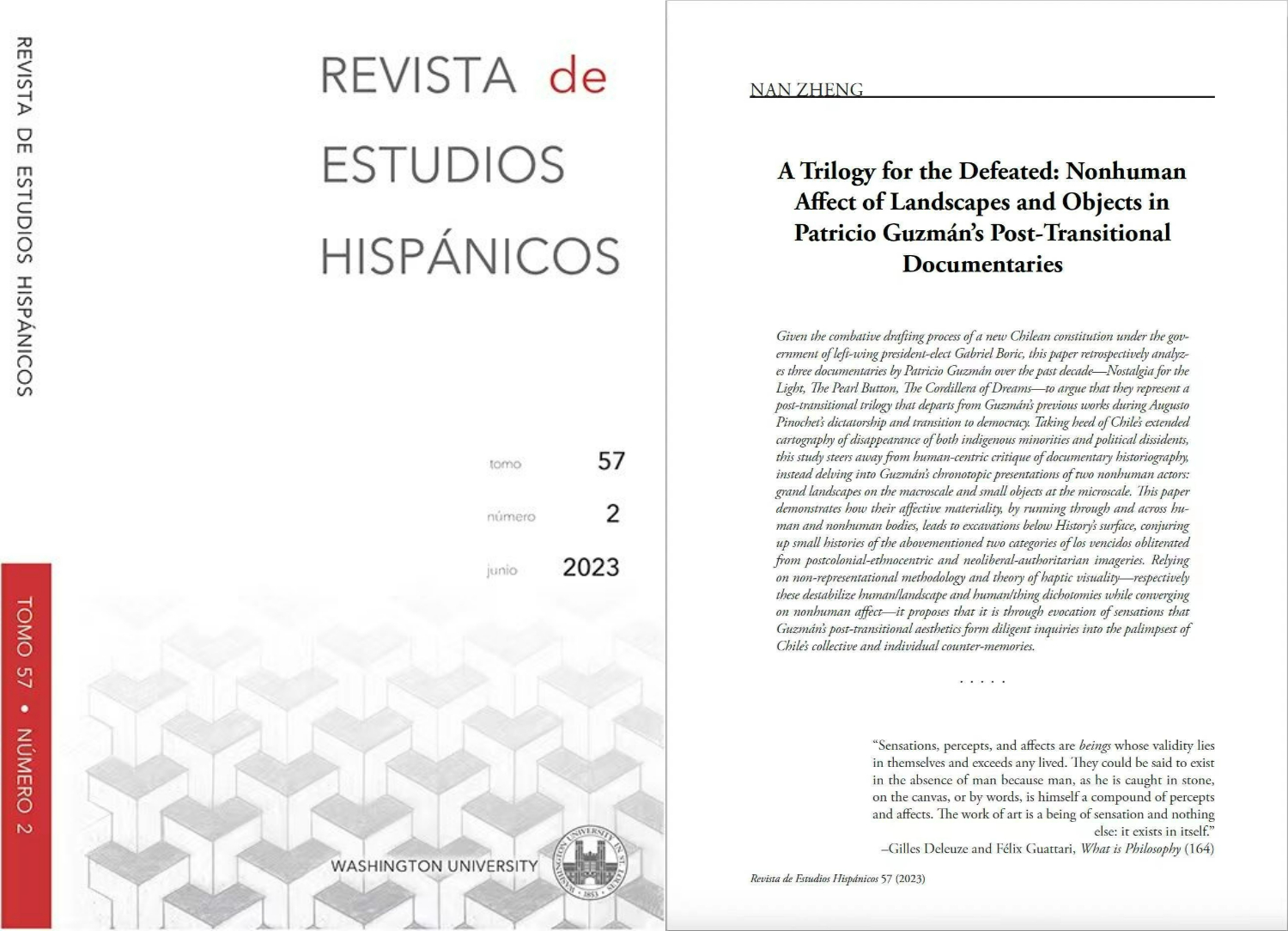 乐动在线中国官方网站西葡意语系助理教授郑楠作为唯一作者的学术研究型论文《献给战败者的三部曲:帕特里西奥·古斯曼民主过渡后纪录片中风景与物件的非人类情动》(“A Trilogy for the Defeated: Nonhuman Affect of Landscapes and Objects in Patricio Guzmán’s Post-Transitional Documentaries”),近期在A&HCI来源期刊《西班牙语世界研究期刊》( Revista de Estudios Hispánicos )2023年第2期刊登。《西班牙语世界研究期刊》由美国圣路易斯华盛顿大学罗曼语语言文学系主办,采用严格的多轮匿名审稿制度,刊登西班牙语国家和地区文学和文化研究、电影研究和文艺理论批评研究等方向的西班牙语或英语学术论文。该期刊现位列JCR期刊引证报告罗曼语文学研究类一区,是国际学术研究界公认的权威期刊。郑楠老师的论文是该期刊自1967年创刊以来中国学者的首次发表,也是国际权威学术期刊第一篇整体研析古斯曼纪录片三部曲并尝试命名的学术研究型论文。