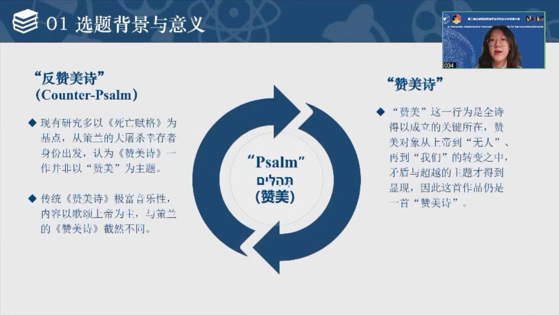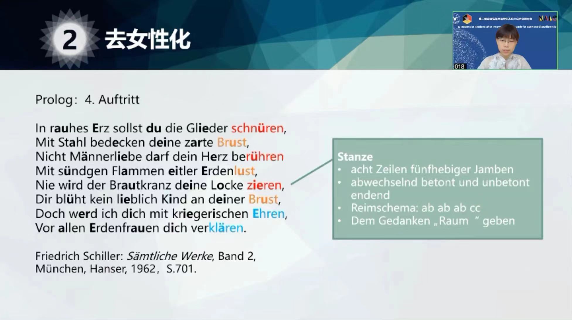 2019级本科生陈靖泽、高昱扬、王子涵、汪广俊分别在毛明超、胡蔚、梁晶晶等老师的指导下,在个人阅读经验的基础上,通过扎实的语文学和阐释学方法完成了高质量的文学论文。陈靖泽在《<奥尔良的童贞女》:一部“去女性化”悲剧》中以德国魏玛古典文学巨擘弗里德里希·席勒的戏剧为核心,探究了十八世纪末欧洲女性面临的两难境地:一方面,女性在刻板的社会分工下,必须摒弃自身女性特质方能进入公共领域;另一方面,对自然性别的刻意压制必定造成女性的个人悲剧。陈靖泽的论文并未局限于既有研究对席勒笔下“英雄女性”的建构,而是通过细致的思想史梳理、形式分析与文本阐释,揭示了席勒剧本中以批判推动欧洲女性解放运动的要义。高昱扬的论文《以“自由”之名——简析<丧失了名誉的卡塔琳娜·勃罗姆>中的媒体暴力》研究了诺贝尔文学奖得主海因里希·伯尔的知名长篇小说,从文学社会学的角度剖析了六十年代德国媒体界所存在的话语权暴力,并结合对相关立法的整理,延伸到德国对于新闻自由与个人权利之间矛盾与平衡的一般机制,挖掘出文学文本的社会关怀。王子涵则详尽阐述了德国著名诗人弗里德里希·荷尔德林的名作《诗人的使命》,研究了这首晦涩颂歌中所呈现的美学观点,指出荷尔德林所塑造的诗人是超验与经验、理念与现实间的桥梁,亦是古典与现代、世界与民族的融合。她所撰写的论文《诗人作为桥梁》能够引发对“文学何为”这一关键问题的深入思考。而汪广俊《“精神黑夜”下的抵抗》一文论述了保罗·策兰六十年代出版的诗集《暗蚀》中所体现出的晚期风格,即蕴藏在无声悲痛中的欢快与对黑暗的反抗。论文不仅分析的策兰的创作,同时探讨了二战后德语文坛对德国历史复杂多样的态度,兼具文学与社会史视野。