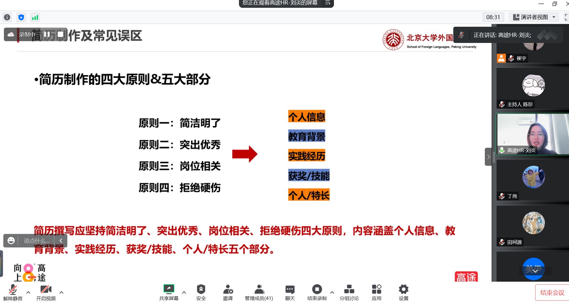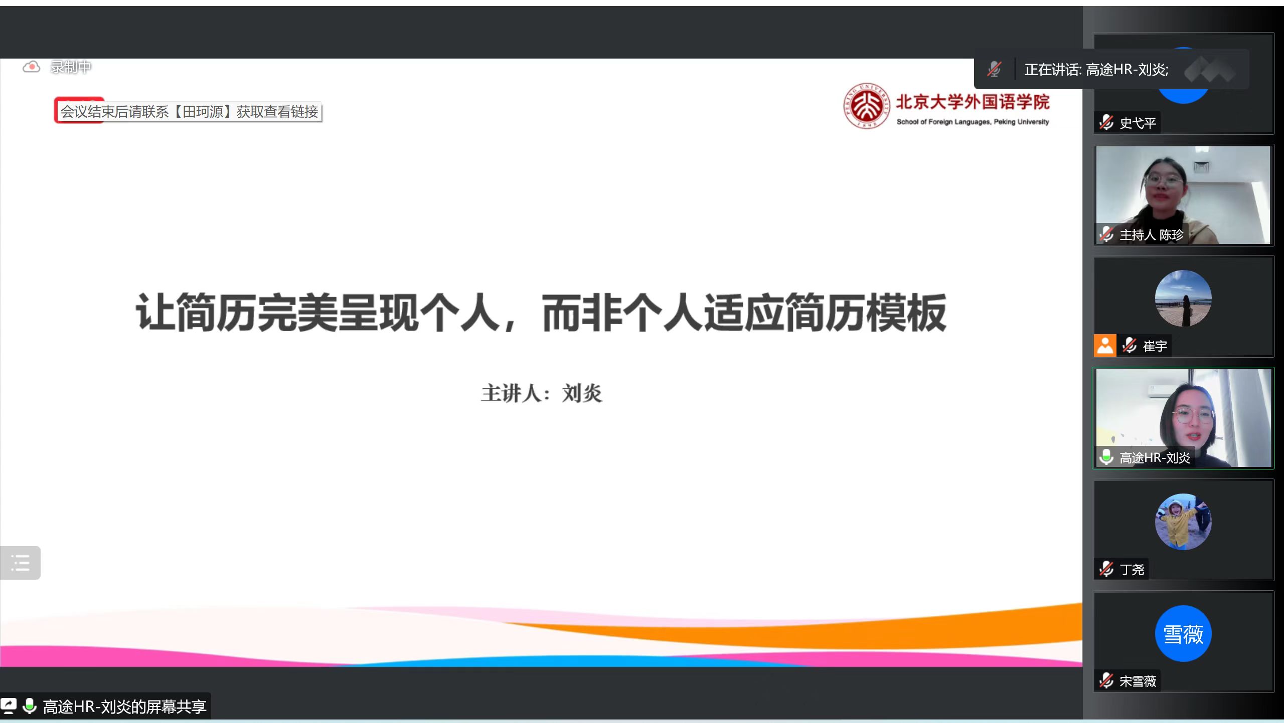 简历是求职的敲门砖,如何制作简历,突出自己的亮点,是毕业生求职必备的知识。为此,外国语学院特邀请高途集团高端校招负责人刘炎为求职路上的外院学子带来了简历制作方法和常见误区指导。10月14日下午,云端“职场启航”简历制作讲座活动通过腾讯会议顺利举行,学院党委副书记王恒、辅导员丁尧出席本次活动。