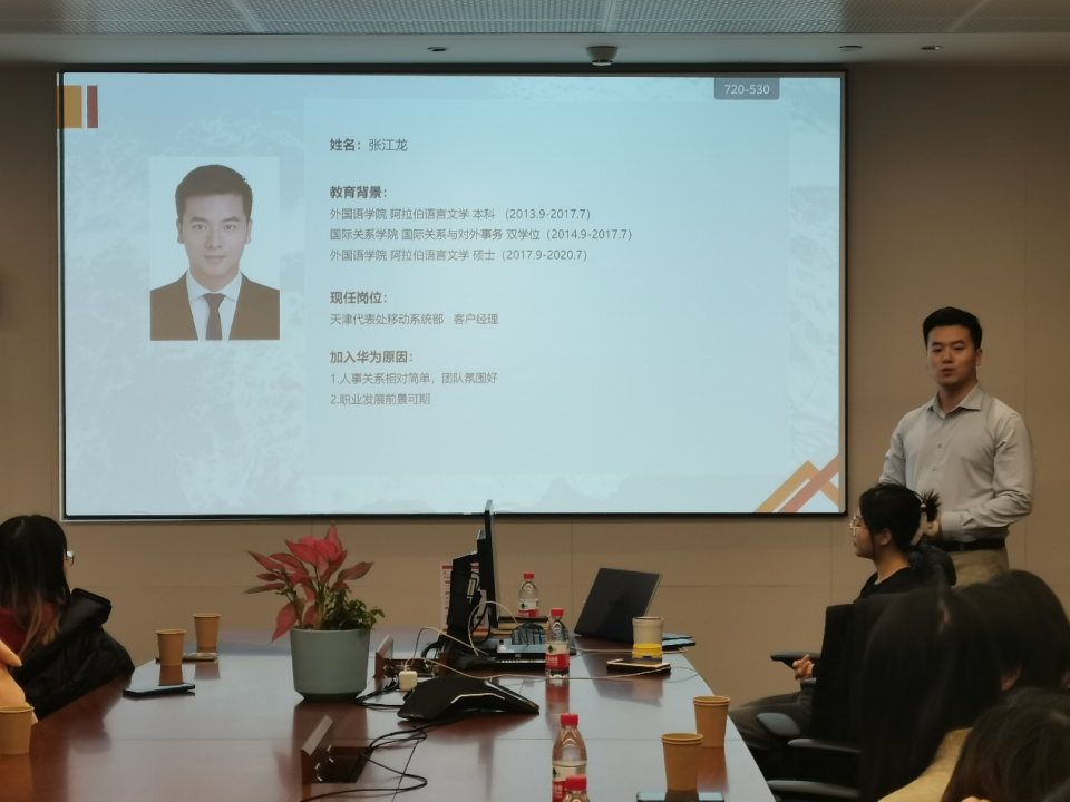 在校企交流环节,外院师生与华为公司工作人员展开了深度交流。华为公司代表介绍了华为的发展历史和经营现状。随后,现任天津代表处移动系统部客户经理的乐动在线中国官方网站2020届硕士毕业生张江龙分享了自己的就职经历。张江龙对外院师生的来访表示欢迎,并全面介绍了工作以来的成长与收获。他首先讲解了华为公司的业务架构,并结合外院学子的专业背景和岗位需求,给出了对求职选岗的建议。