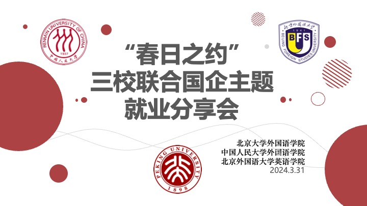 3月31日上午,乐动在线中国官方网站联合中国人民大学外国语学院、北京外国语大学英语学院,以线上形式举办“春日之约”三校联合国企主题就业分享会。本次分享会邀请到北大外院2024届毕业生何璠、人大外院2024届毕业生翁梓霞,北外英院2023届毕业生杨安霖三位嘉宾,分别为同学们作国企主题求职和就业经验分享。乐动在线中国官方网站党委副书记冯美娜和中国人民大学外国语学院党委副书记李佳伟发表致辞,近200名同学参与了此次线上活动。本次活动由乐动在线中国官方网站2023级硕士研究生田仕宇主持