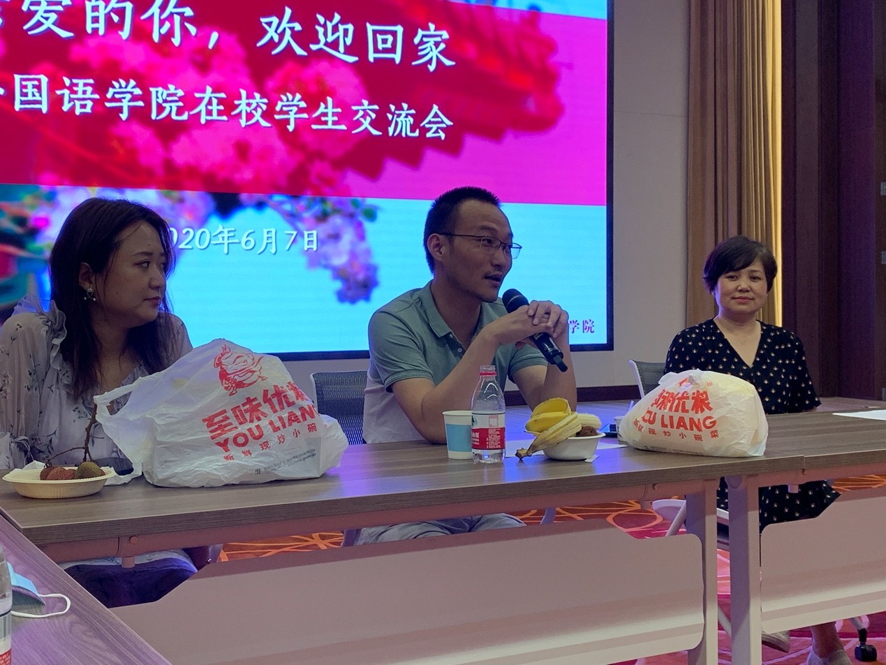 6月7日晚,外国语学院在民主楼208报告厅召开“亲爱的你,欢迎回家”部分返校湖北毕业生及在校生交流会。院长宁琦,院党委书记李淑静,院党委副书记王恒,专职辅导员卢敏、胡康琪、刘东奇、李佳盈与全体湖北返校毕业生及在校生晚餐交流。参会同学分享了在湖北、燕园抗疫的经历,讲述了返校途中的所见所闻、所思所想,引起了在场师生的共鸣。