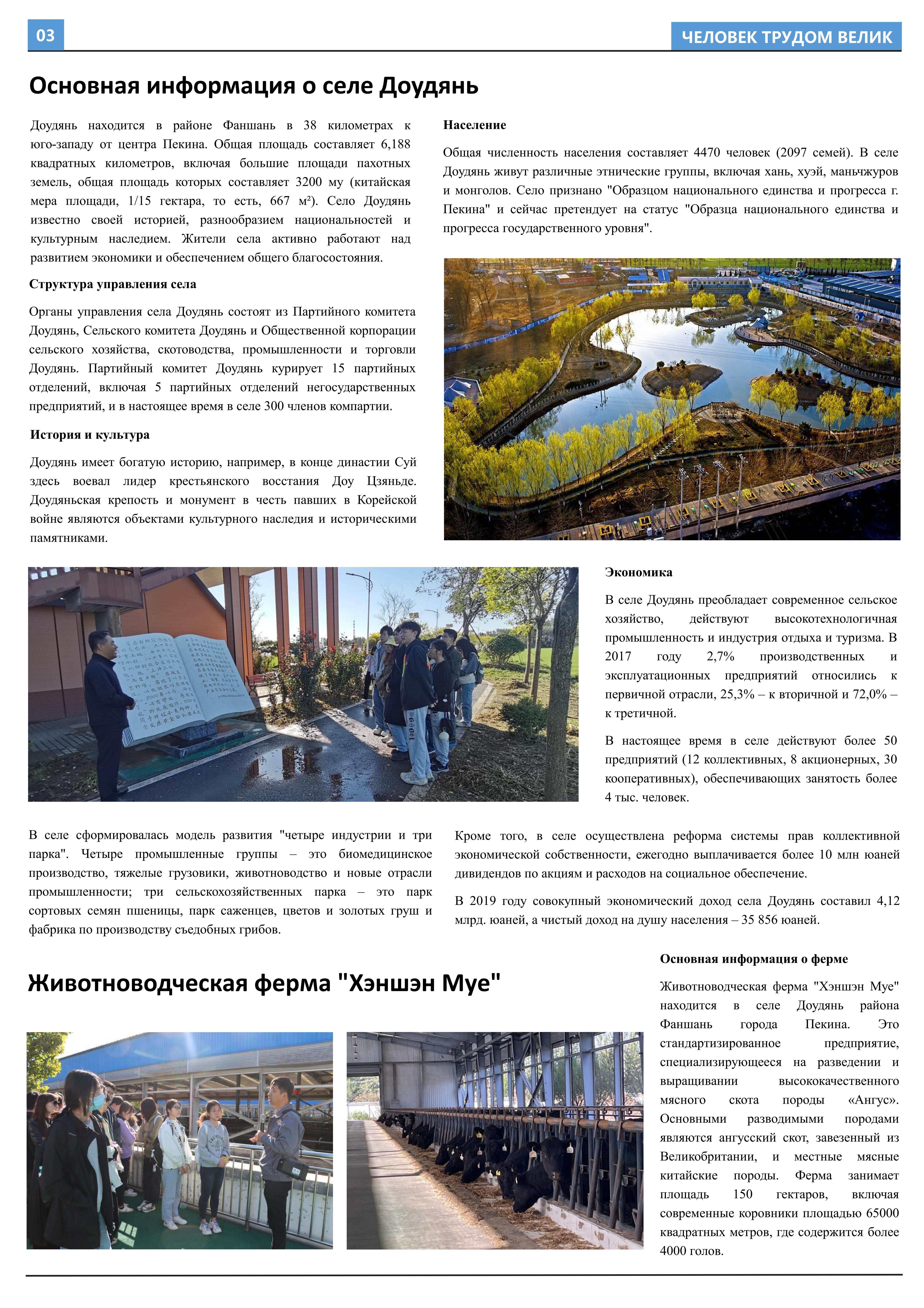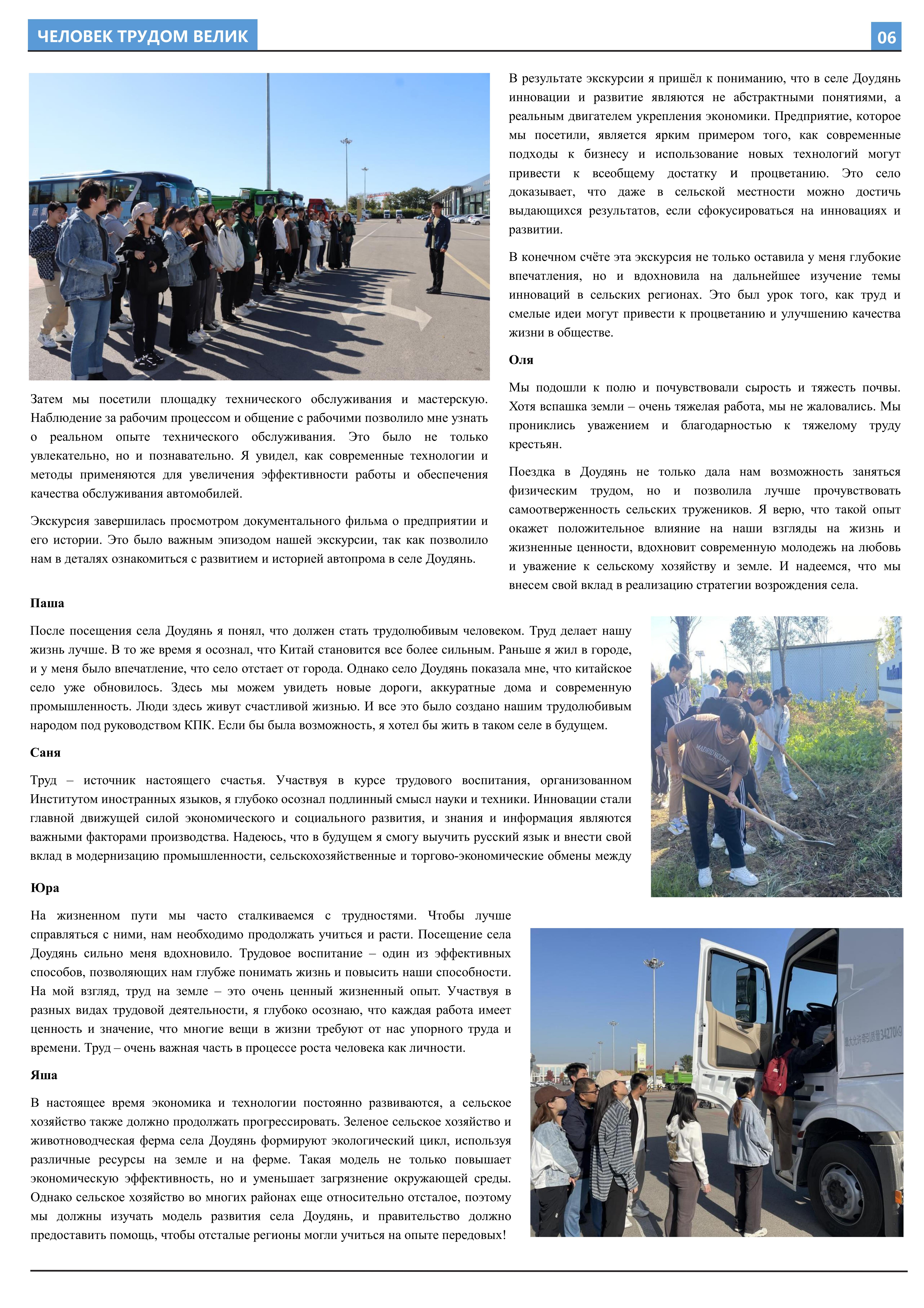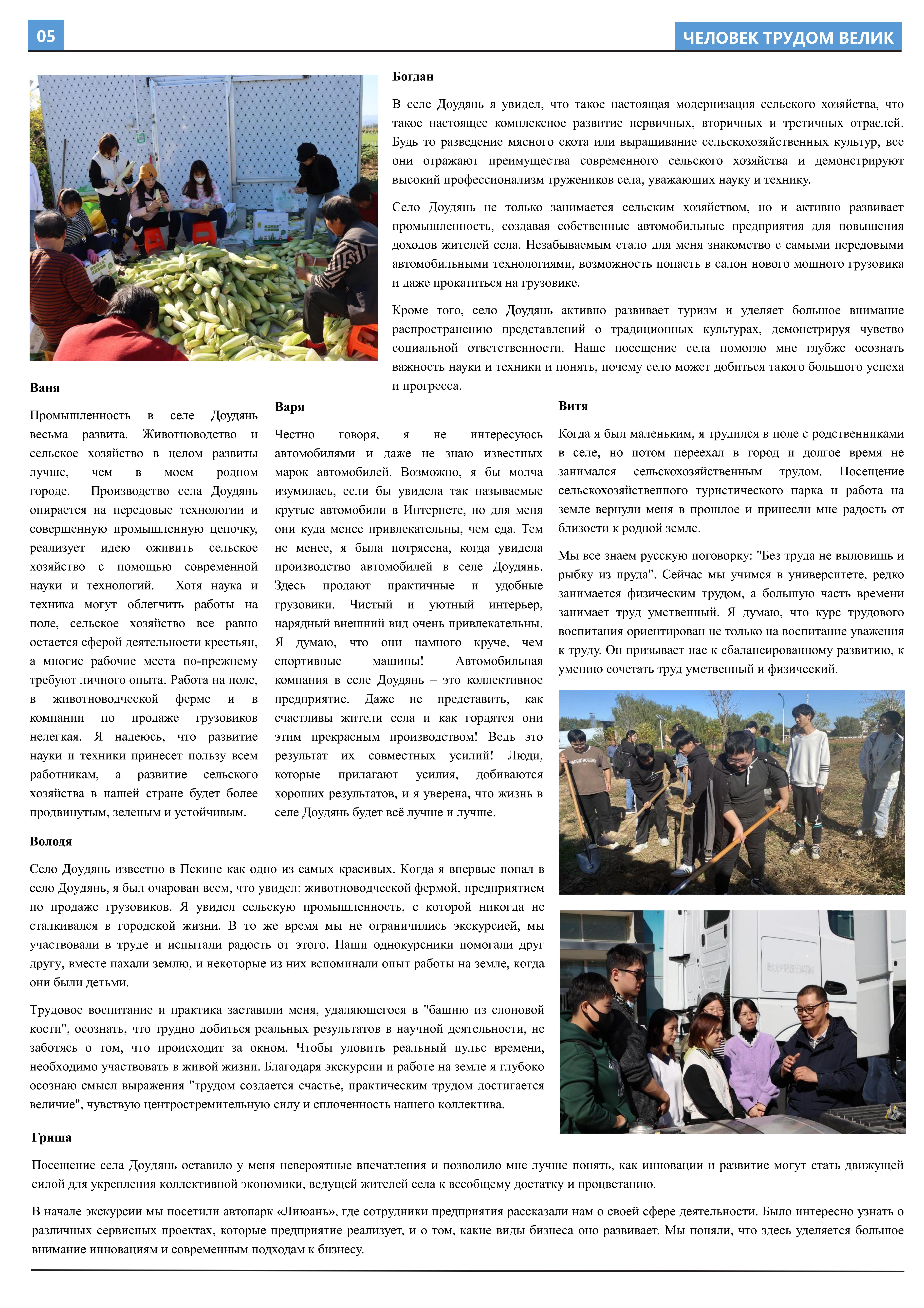 在接受劳动教育、参与劳动实践后,2023年10月至2023年12月,外国语学院2021级俄语本科生班的11名同学立足于学院平台和专业课堂(《俄语报刊阅读(上)》与《俄语写作(上)》),在两位课程主讲教师王帅和外教叶莲娜·马尔卡索娃(Елена Маркасова)的指导下,通过线上分工、小组讨论等形式商讨报纸细节,并学习使用重要概念和关键词句的俄语表达,历时近三个月,共同完成6个版面、3000余个单词数的“劳动成就人——关于劳动教育”主题报纸。报纸共分为8个大主题、13个小主题,全面介绍了外国语学院劳动教育课程的实施背景及学生参与情况,系统阐述了窦店村的历史文化与经济发展等多方面内容,并详细记录了同学们在窦店村恒升牧业畜牧养殖中心、窦店利元车业、农业观光园等劳动教学点的劳动实践与参访感受。