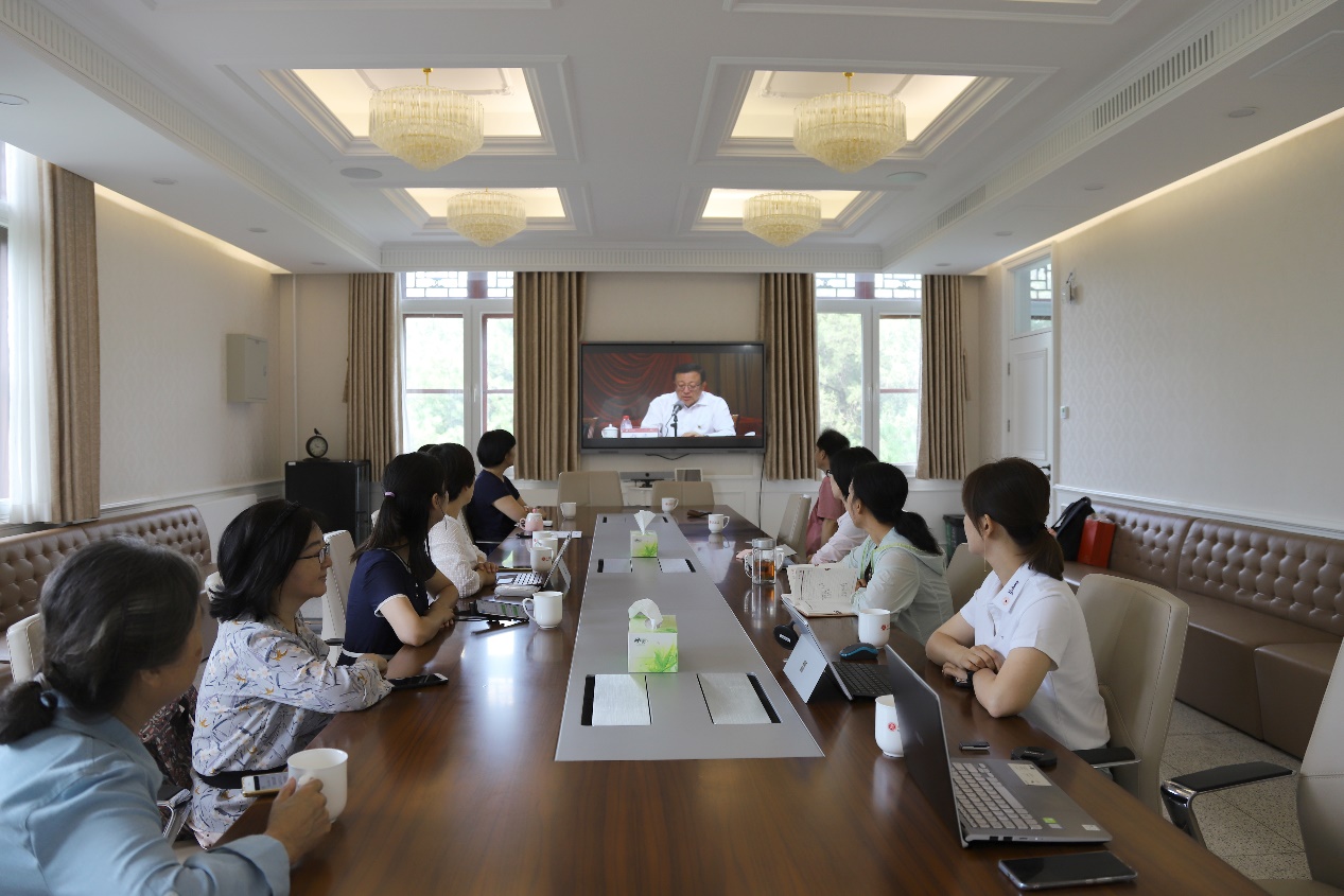 2021年7月2日上午,北京大学学习习近平总书记在庆祝中国共产党成立100周年大会上的重要讲话精神暨“两优一先”表彰大会在百周年纪念讲堂观众厅隆重举行。外国语学院党委委员、教职工与离退休党员代表在外文楼206会议室集体收看大会直播。