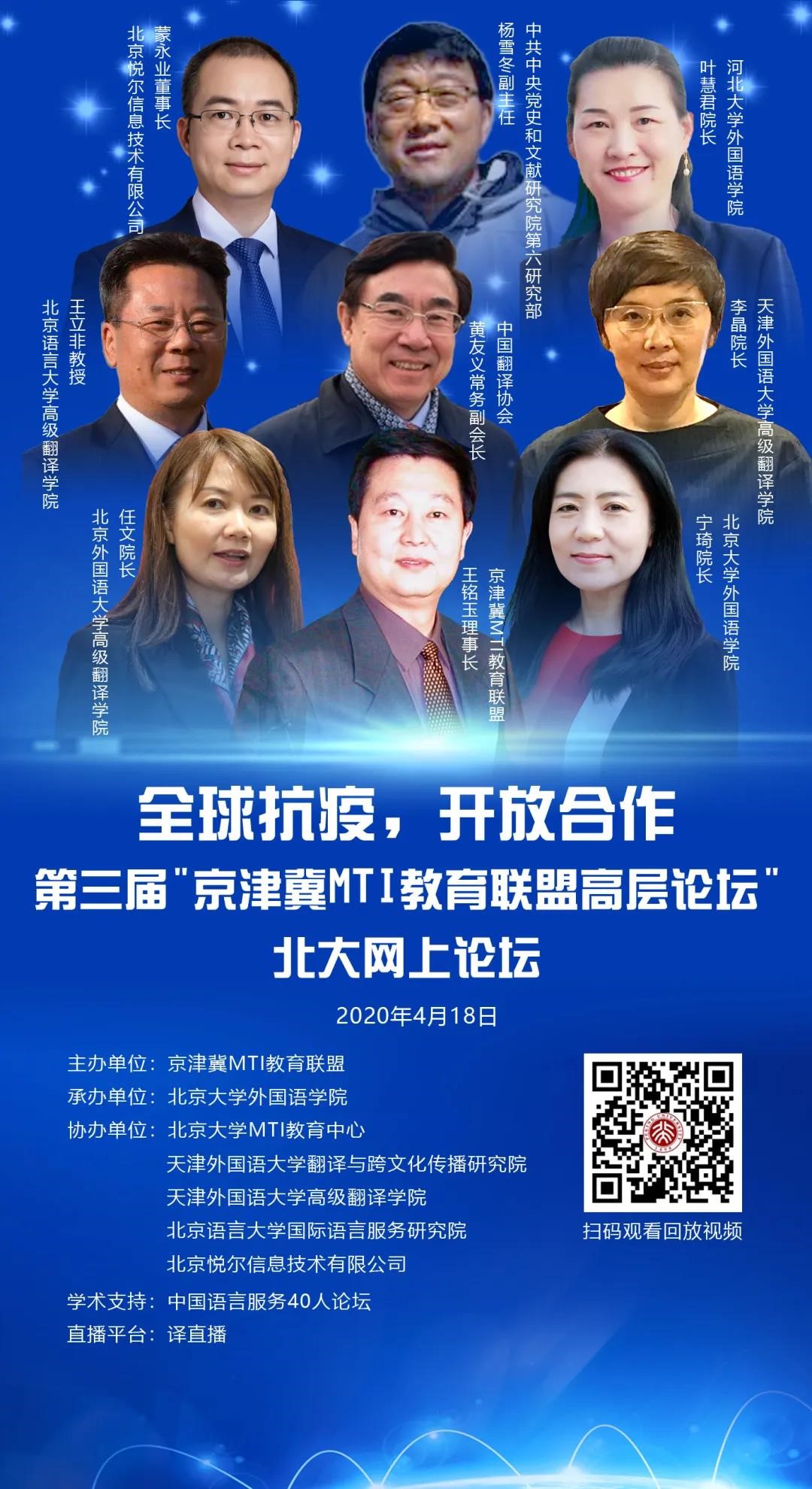 4月18日,以“全面凝聚抗疫合力,加强京津冀语言服务合作”为主题的第三届“京津冀MTI教育联盟高层论坛”北京大学网上论坛成功举行。本次论坛由京津冀MTI教育联盟主办,乐动在线中国官方网站承办,北京大学MTI教育中心、天津外国语大学翻译与跨文化传播研究院、天津外国语大学高级翻译学院、北京语言大学国际语言服务研究院、北京悦尔信息技术有限公司共同协办。中国语言服务40人论坛提供学术支持,新华网、人民网、光明网、新浪网、凤凰网、中国网等提供媒体支持,论坛译直播平台同步直播。共有来自145个机构的202名人员报名参会,其中来自境内高校178人,境外高校5人,翻译行业15人,其他机构4人。译直播平台有14442人收看同步直播。