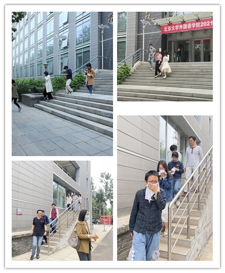 楼内师生员工和物业人员相互配合,按照事先制定的《外国语学院消防疏散预案》,全体人员在三分钟内顺利完成了疏散逃生,包括当时正在楼内进行科研、教学的老师,小组研讨的同学,正在地下二层图书分馆阅读的师生。大家都用学院提前发放的消防湿毛巾捂住口鼻,伏低身体,根据安全出口指示标识指引,按照远离起火点和就近原则,分别从南侧室内楼梯和北侧室外楼梯迅速有序地离开了大楼,到达指定集合地点。