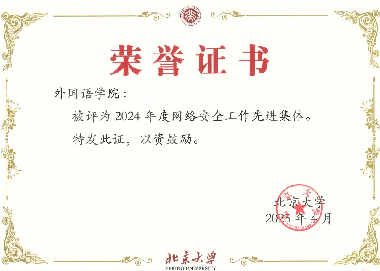 外国语学院荣获北京大学2024年度网络安全工作先进单位和首届网信宣传教育示范单位