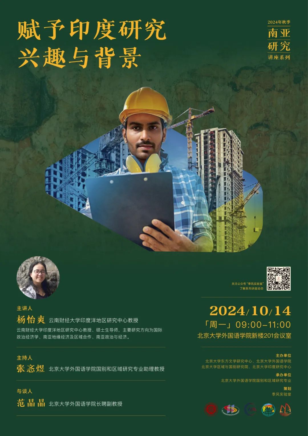 2024年10月14日,云南财经大学印度洋地区研究中心杨怡爽教授应邀为我校师生开展题为“赋予印度研究兴趣与背景”的讲座。本次讲座是由北京大学东方文学研究中心、外国语学院、区域与国别研究院和印度研究中心主办,外国语学院国别和区域研究专业承办的2024年秋季学期南亚研究系列讲座的第二讲。讲座由乐动在线中国官方网站国别和区域研究专业助理教授张忞煜主持,乐动在线中国官方网站长聘副教授范晶晶参与讨论。