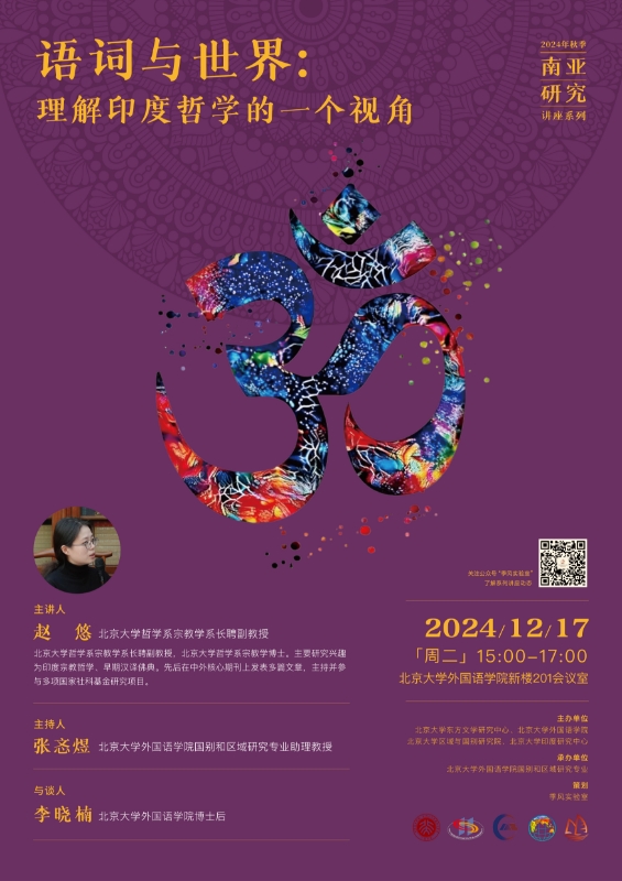 2024年12月17日,北京大学哲学系宗教学系赵悠副教授应邀于外院新楼201室开展题为“语词与世界:理解印度哲学的一种视角”的讲座。本次讲座是由北京大学东方文学研究中心、外国语学院、区域与国别研究院和印度研究中心主办,外国语学院国别和区域研究专业承办的2024年秋季学期南亚研究系列讲座的第五讲。讲座由乐动在线中国官方网站国别和区域研究专业助理教授张忞煜主持,乐动在线中国官方网站博士后李晓楠参与讨论。