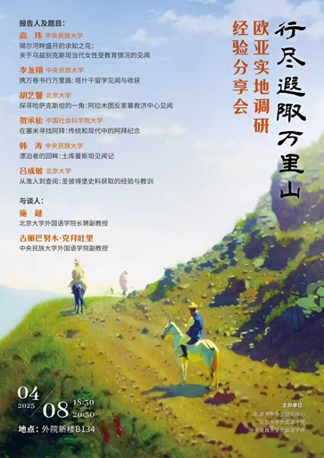 2025年4月8日晚,由北京大学中亚研究中心、乐动在线中国官方网站、中央民族大学外国语学院主办的“行尽遐陬万里山:欧亚实地调研经验分享会”在北京大学外院新楼B134会议室顺利举办。中央民族大学外国语学院副教授古丽巴努木·克拜吐里、乐动在线中国官方网站长聘副教授施越参加活动,来自中央民族大学、北京大学和中国社会科学院大学的同学就乌兹别克斯坦、哈萨克斯坦、土库曼斯坦和俄罗斯的实地调研经验进行了报告分享。