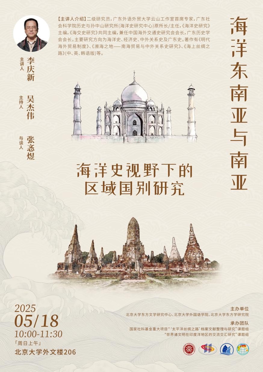 2025年5月18日上午,广东外语外贸大学云山工作室首席专家,二级研究员李庆新教授为北京大学师生做了主题为“海洋东南亚与南亚——海洋史视野下区域国别研究思考”的讲座。本次讲座由北京大学东方文学研究中心、乐动在线中国官方网站、北京大学东方学研究院主办,“‘太平洋丝绸之路’档案文献整理与研究”课题组和“世界诸文明在印度洋地区的交流交汇研究”课题组联合承办。讲座由吴杰伟教授主持,张忞煜助理教授参与讨论。