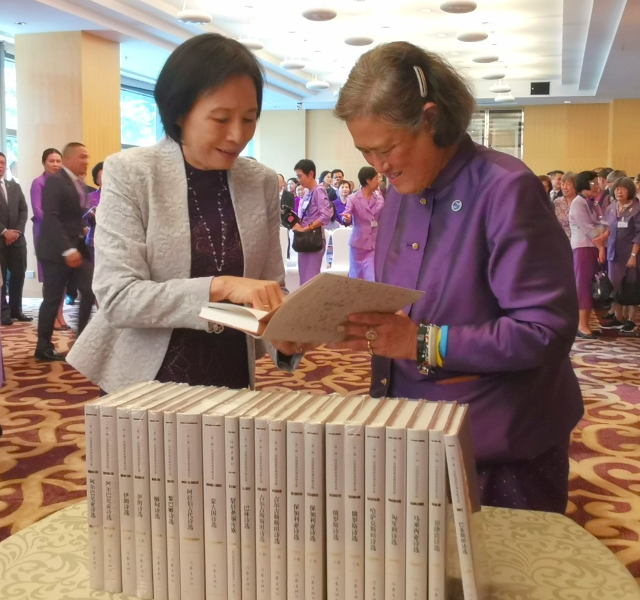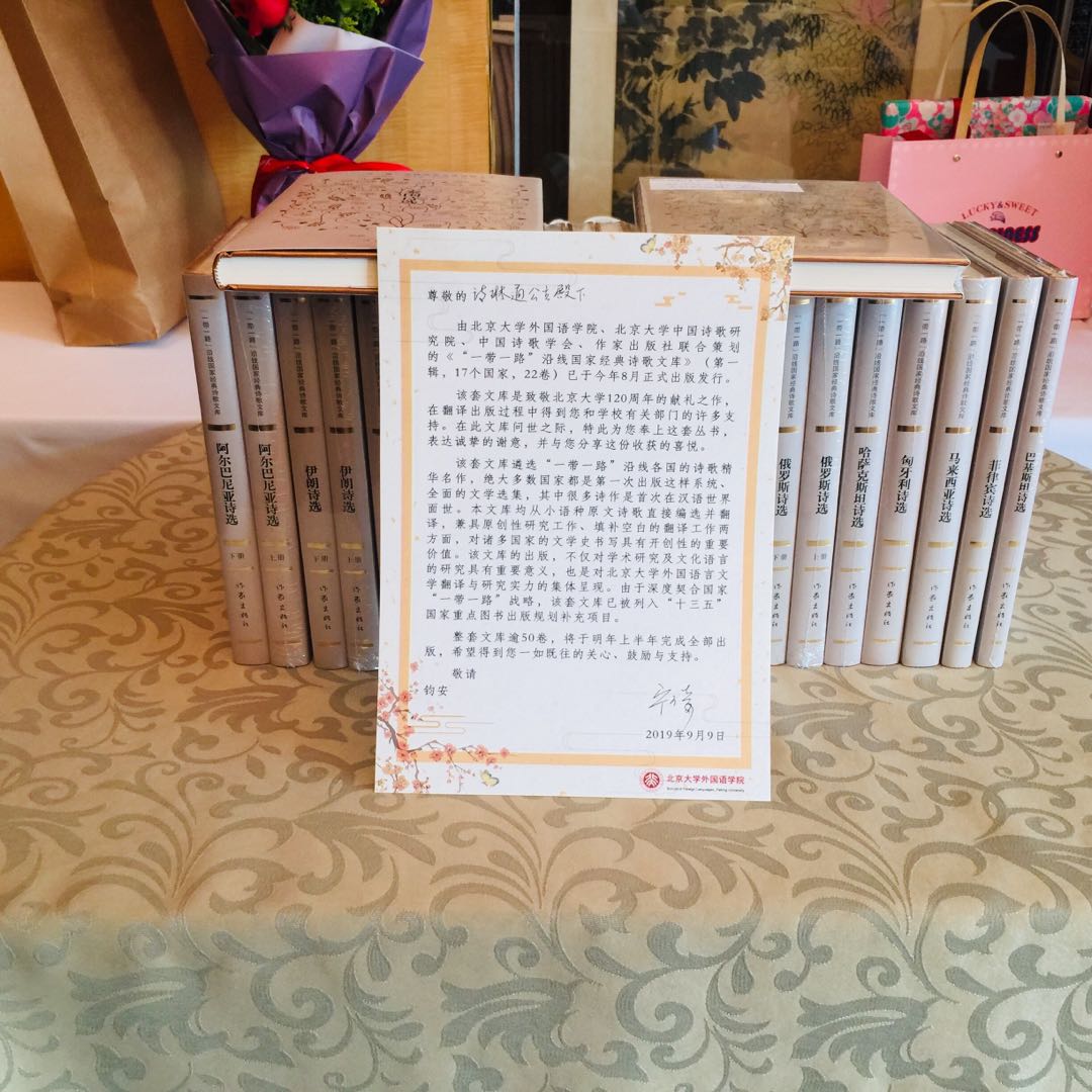 2019年9月29日下午,泰王国诗琳通公主在参加完中华人民共和国国家勋章和国家荣誉称号颁授仪式之后,前往北京丽思卡尔顿酒店宴请前任中国驻泰大使和公主的汉语教师代表。我国泰语界著名专家、翻译家、诗琳通讲席教授裴晓睿受邀参加了此次宴请活动,并作为译者之一向公主赠送了由北大外国语学院、北大中国诗歌研究院和作家出版社联合策划出版的《“一带一路”沿线国家经典诗歌文库》(第一辑)一套。