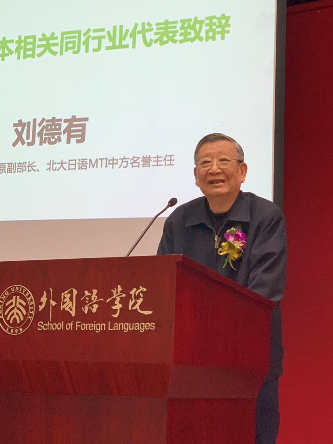 原文化部副部长、北京大学日语MIT中方名誉主任刘德有在致辞中说自己一直以来与北大日语系有着深切的缘分、深厚的感情,希望以日语系系友会的成立为纽带,进一步牢固同窗之情,为中日两国之间建立长期稳定、健康发展的友好关系,从而为切实造福两国人民做出努力和贡献。