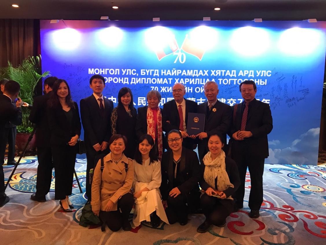 2019年10月16日,由中国人民对外友好协会和蒙古国驻华大使馆主办的庆祝中华人民共和国与蒙古国建交70周年庆典招待会在北京中国大饭店隆重举行。全国人大常委会副委员长白玛赤林,中国人民对外友好协会副会长宋敬武,中华人民共和国外交部亚洲司副司长薛剑,蒙古国驻华大使丹•冈呼雅格,蒙古国国防部部长尼亚马•恩赫包勒德等来自中蒙两国各界及其他国家驻华使节代表约450人出席。