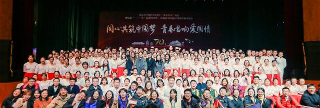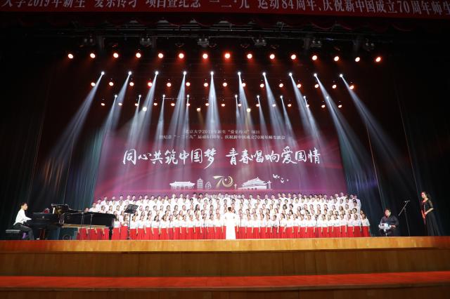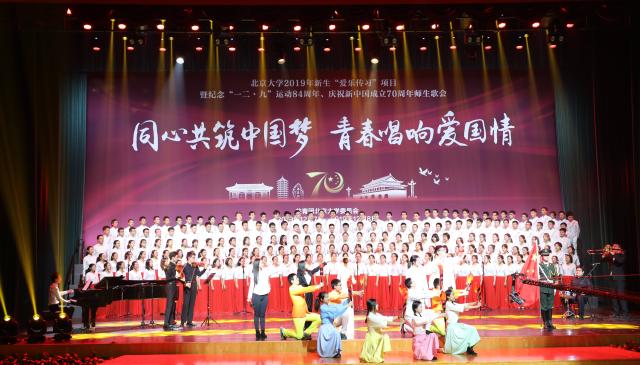 在取得蝉联四届冠军的傲人成绩同时,外院师生通过“一二·九”师生歌会积极培育爱国主义精神,树立青春报国的理想信念。北京大学“爱乐传习”项目暨“一二•九”师生歌会历来是外国语学院开展爱国主义、集体主义与美育教育的重要载体。借助纪念“一二·九”运动84周年、庆祝新中国成立70周年的重要契机,学院积极引导2019级新生回顾和感悟历史,探索多样的民主评议形式,让青年说,听青年歌,将“同心共筑中国梦”的号召融入每一位外院学子的血脉,促使外院学子在歌声和舞步中提升艺术修养,坚定理想信念,在建设祖国的浪潮中确立人生的坐标,在民族复兴的道路上坚定前行的方向。