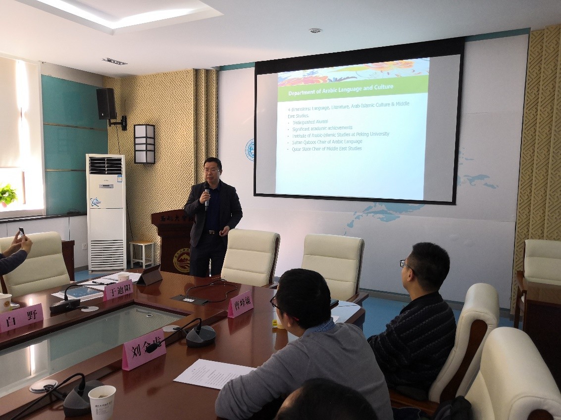 首先,西北大学中东研究所副所长李福泉教授向全体到场师生致欢迎辞。李福泉教授对中东所的历史沿革、团队建设、研究方向、学术交流、人才培养等方面进行了详细介绍,并展望了双方在期刊建设、学术交流、研究报告等领域的合作空间。乐动在线中国官方网站副院长付志明教授对西北大学的热情款待表示了感谢,并介绍了北大外国语学院在外语学科建设方面的成就与中东研究领域的人员构成、机构设置以及相关文化与学术交流机制。付志明教授表示,北京大学与西北大学多年来有着深厚的友谊和渊源,本次参访调研对双方而言都是良好的交流与学习机会。