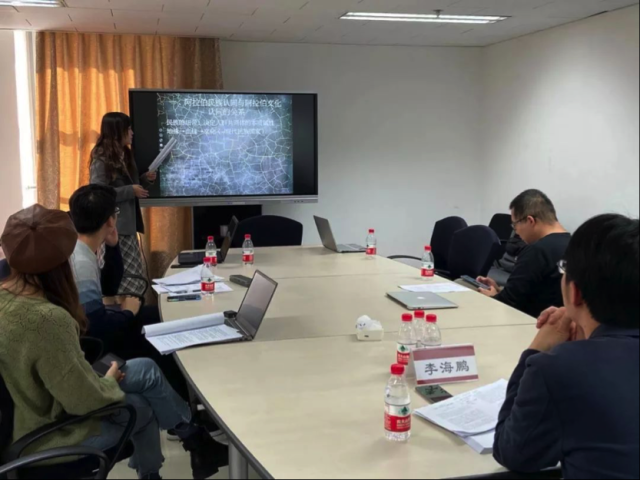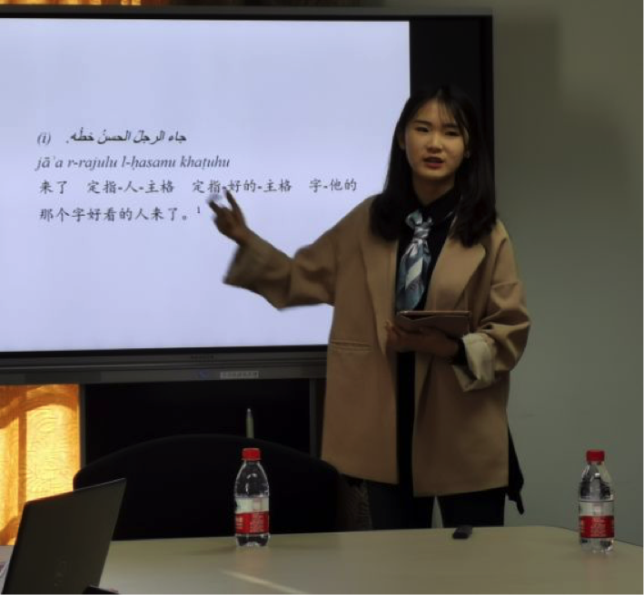 第二时段的研讨由大连外国语大学硕士研究生侯英杰主持,北京外国语大学副教授叶良英评议。北京第二外国语学院硕士研究生祁弘、北京第二外国语学院硕士研究生高子玥、西安外国语大学硕士研究生裴丹青和北京第二外国语学院硕士研究生朱佳璐进行发言,题目分别为《阿拉伯媒体涉华政治新闻的批评性话语分析》、《浅谈中阿死亡委婉语的对比研究》、《从〈穆斯林的葬礼〉看经堂语词汇来源》、《纳吉布•马哈福兹〈自传的回声〉第一人称叙事手法的作用研究》。叶老师评议时表示,作为阿拉伯语专业的研究生,应该以阿拉伯语原文而非中文译本为研究对象,同时在研究方向的选择上也要注意思考,切忌空泛随意,研究时要对研究对象进行深入细致的考察,注重论证内容和结论相关性。