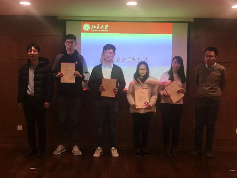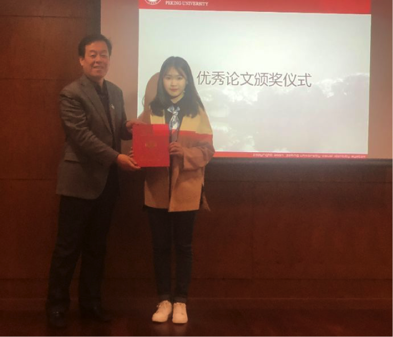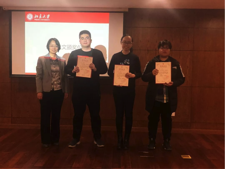 总结发言后,闭幕式进入了优秀论文颁奖环节。本届论坛由各评议老师组成专家评审组,经过认真的讨论之后,评选出优秀论文10篇,来自北京大学、北京外国语大学、对外经济贸易大学、上海外国语大学和北京第二外国语学院的同学分别获得各个等级的奖项,包括特等奖1篇、一等奖2篇、二等奖3篇与三等奖4篇。李海鹏、施越、叶良英、肖凌、付志明等老师为获奖同学颁发了获奖证书和奖品。