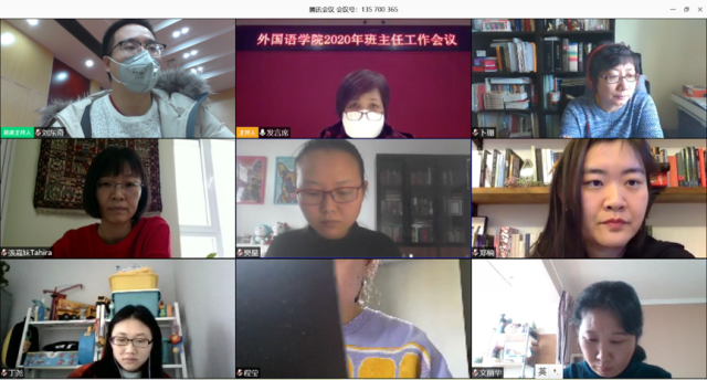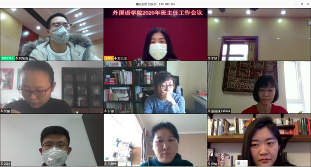 为落实学校和学院对近期疫情防控工作的相关要求,保障新学期教学和学生工作的顺利开展,2月14日,外国语学院举行全院班主任视频工作会议。学院院长宁琦,党委书记李淑静,副院长付志明、王丹,党委副书记王恒,团委书记卢敏,专职辅导员刘东奇在新楼501会议室参加现场会议,全体班主任、第二班主任和专职辅导员共80余人参加线上会议。会议由王恒主持。