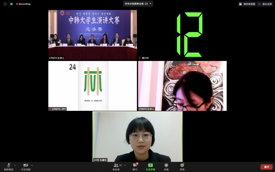 2020年11月18日,外国语学院朝鲜(韩国)语言文化系本科三年级张宇淏同学在“中韩大学生演讲大赛”全国总决赛中荣获第一名。共同入围总决赛的仇康化同学获得鼓励奖。
