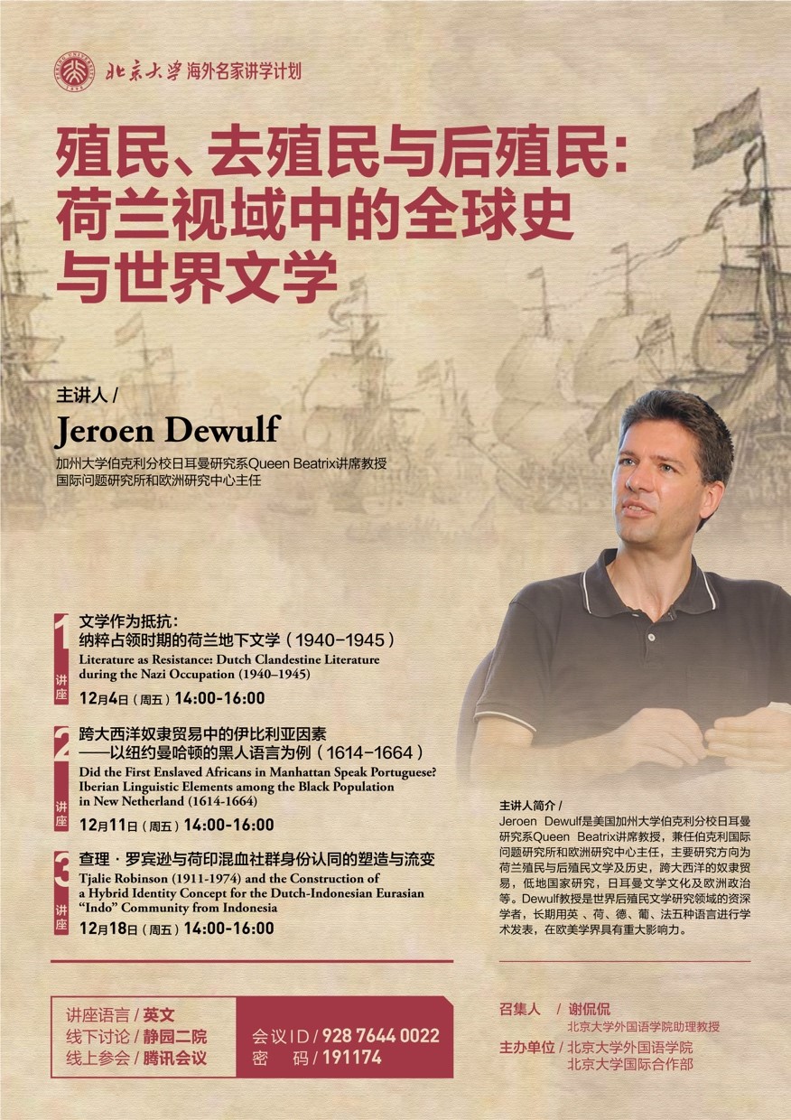 2020年12月,乐动在线中国官方网站在国际合作部“海外名家讲学计划”的支持下主办了三场题为“殖民、去殖民与后殖民:荷兰视域中的全球史与世界文学”的系列讲座。主讲人杰罗恩•德伍夫(Jeroen Dewulf)是加利福尼亚大学伯克利分校日耳曼研究系贝娅特丽克丝女王讲席教授(Queen Beatrix Chair Professor),兼任伯克利国际问题研究所和欧洲研究中心主任,主要研究方向为荷兰殖民与后殖民文学及历史,跨大西洋的奴隶贸易,低地国家文化,日耳曼文学及欧洲政治等。德伍夫教授是世界殖民与后殖民研究领域的资深学者,长期用英 、荷、德、葡、法五种语言进行学术发表,在欧美学界具有重大影响力。受疫情影响,德伍夫教授未能到达燕园现场,因此系列讲座以线上线下相结合的方式进行,演讲同时在腾讯会议、哔哩哔哩等网上平台上直播,吸引了北京大学校内外的众多学者和同学观看、学习和讨论。