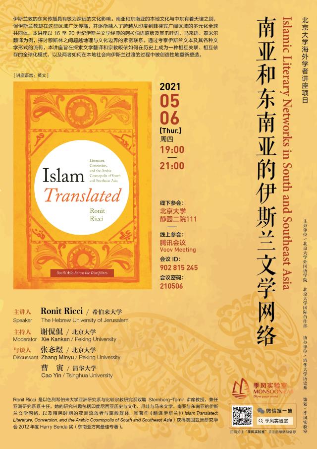 2021年5月6日,外国语学院在国际合作部“海外学者讲座项目”的支持下举办了“南亚和东南亚的伊斯兰文学网络”的主题讲座。主讲人Ronit Ricci是以色列希伯来大学亚洲研究系与比较宗教研究系Sternberg-Tamir双聘讲席教授,兼任亚洲研究系系主任,主要研究方向为印度尼西亚历史与文化、爪哇与马来文学、南亚与东南亚伊斯兰文学网络,以及殖民时期的亚洲流放者与离散群体。讲座由东南亚系助理教授谢侃侃主持,国别和区域研究专业助理教授张忞煜、清华大学历史系副教授曹寅作为与谈人参与了讨论。