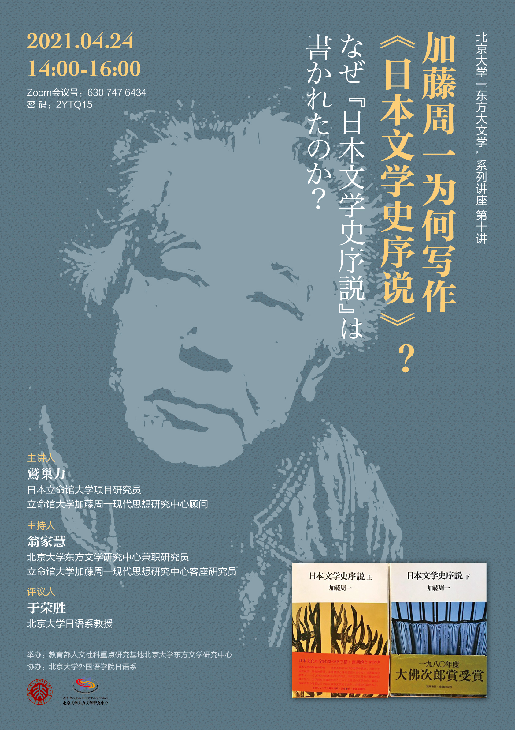 4月24日,北京大学东方文学研究中心成功举办“东方大文学”系列讲座第十讲“加藤周一为何写作《日本文学史序说》?”。主讲人鷲巢力研究员曾担任日本立命馆大学加藤周一现代思想研究中心主任,筹建并成立了加藤周一文库,现为该中心顾问。其个人专著有《阅读加藤周一》(2011)《加藤周一如何成为“加藤周一”:重读〈羊之歌〉》(2018)等,在加藤周一现代思想、日本战后文学史和思想史研究领域具有重要影响。受疫情影响,讲座采用线上方式进行,国内外高校师生近百人观看并参与了讨论。本次讲座由外国语学院日语系协办,东方文学研究中心主任助理、日语系副教授翁家慧担任主持,日语系教授于荣胜担任评议人。