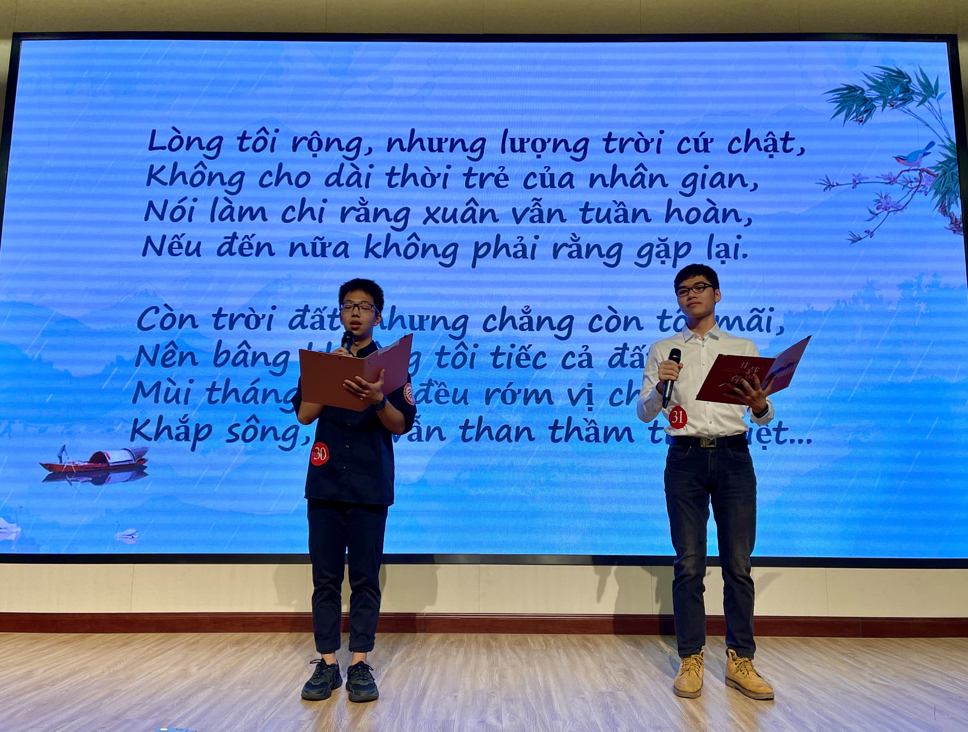 朗诵大赛正式开始。第一组登台的选手语调温柔,感情饱满,两位选手配合默契,使台下的老师和同学们仿佛瞬间来到了优美的诗意花园。而第二组选手的朗诵则将一个为国为民、鞠躬尽瘁的胡志明主席形象生动地呈现在观众面前,让人很难不为之动容。在选手们的精彩呈现下,观众仿佛一会徜徉在金色的田野上,有花香作伴,有清风相随;一会又来到了战火纷飞的前线,眼见满目疮痍,令人心碎。选手们随着音乐切换队形,彼此交流。语调时而深沉时而婉转,情感逐步推进,或辅之以吟唱,或佐之以演绎。选手们的精彩朗诵使一首首优美深情的诗歌鲜活了起来,带来了一场极致的感官盛宴,那些温柔有力的诗句似乎穿越了时空的隔膜,触碰到每个人温暖的掌心。诗歌之美如同清泉一般注入心魂,无数情感在这一刻交织,优美的语言、深情的表达触动着每一位越语人的神经,台下掌声久久不息。