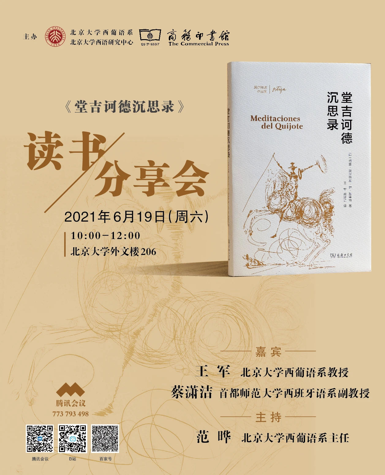 2021年6月19日上午,北京大学西葡语系、北京大学西班牙语中心、商务印书馆在北京大学外文楼举办了西班牙哲学家奥尔特加《堂吉诃德沉思录》读书分享会,邀请王军(北京大学西葡语系教授)、蔡潇洁(首都师范大学西班牙语系副教授)两位译者分享翻译体会和研究心得。