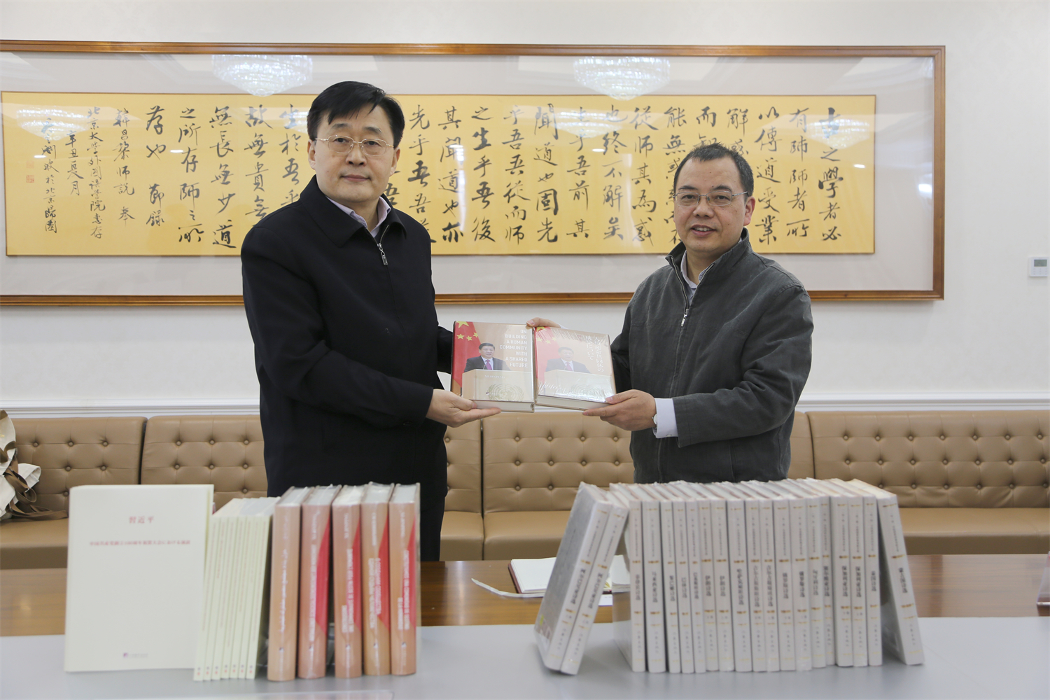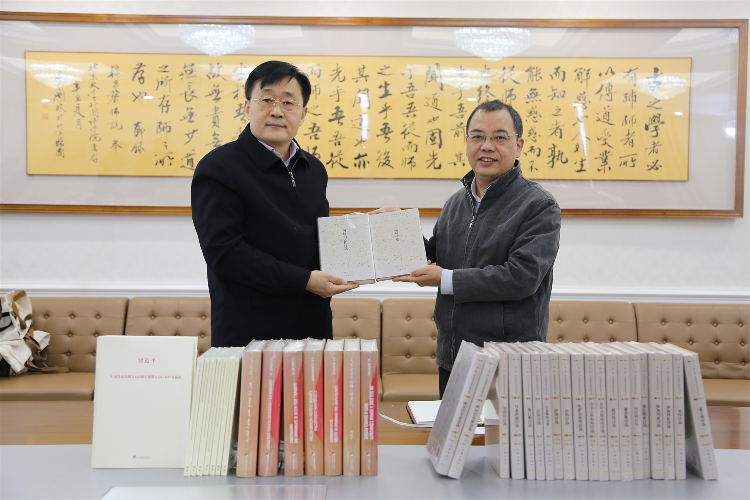 最后,第六研究部向外国语学院赠送习近平《论坚持推动构建人类命运共同体》、十九届六中全会文件汇编、习近平《在庆祝中国共产党成立100周年大会上的讲话》七语种版本。外国语学院向第六研究部赠送《“一带一路”沿线国家经典诗歌文库》系列丛书与纪念文创。