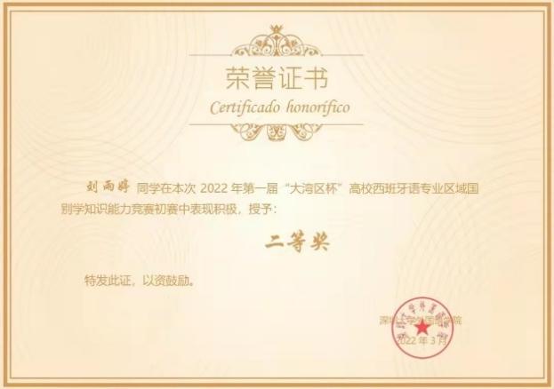 北京大学西班牙语专业注重学生人文素质和综合能力的培养,倡导学生“一专多精”,鼓励学生在钻研专业课程之余积极选修其他学科课程,支持学生参加各类学科竞赛,提高知识水平,锻炼专业能力,提升跨学科知识应用能力和跨文化行为能力。 刚刚过去的2022年1月,西班牙语专业18级本科生刘畅同学荣获了广东外语外贸大学主办的“云山杯”首届国际口译远程大赛汉西交传组决赛亚军。