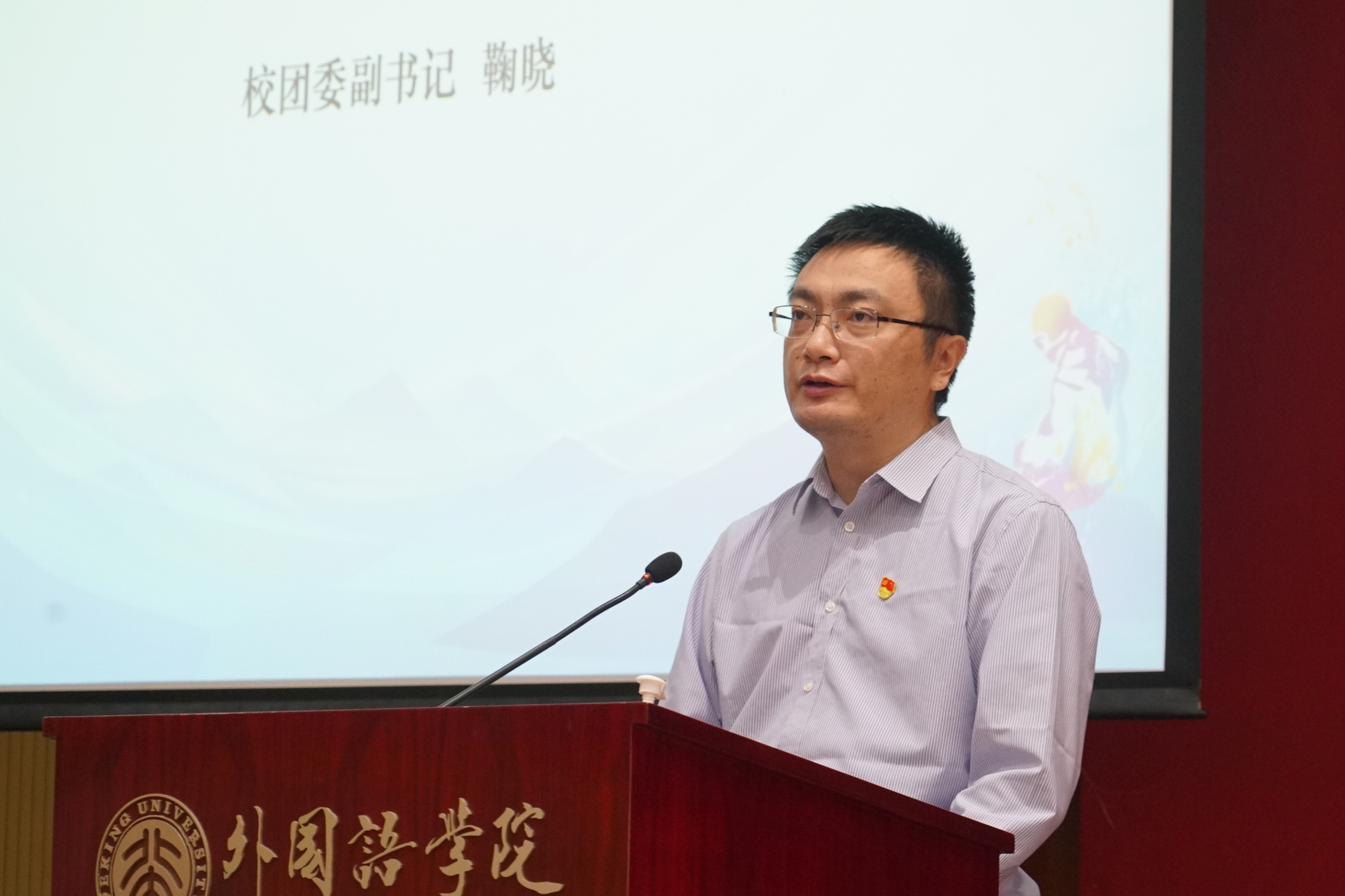 校团委副书记鞠晓代表校团委向完成冬奥会和冬残奥会的外院师生致以了诚挚的感谢和崇高的敬意。他指出,外国语学院冬奥志愿者团队人数在全校各院系名列前茅,是北大不可或缺的主力军,并激励外院学子继续与党同心、与国同行,让青春之花绽放在党和人民最需要的地方。