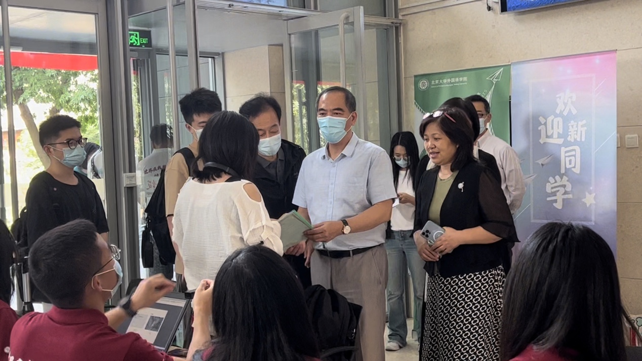 上午9;20,北京大学校长龚旗煌一行来到外院新楼看望前来报到的研究生同学,了解新生注册情况,关心迎新人员的工作进展,并与学生亲切交谈。