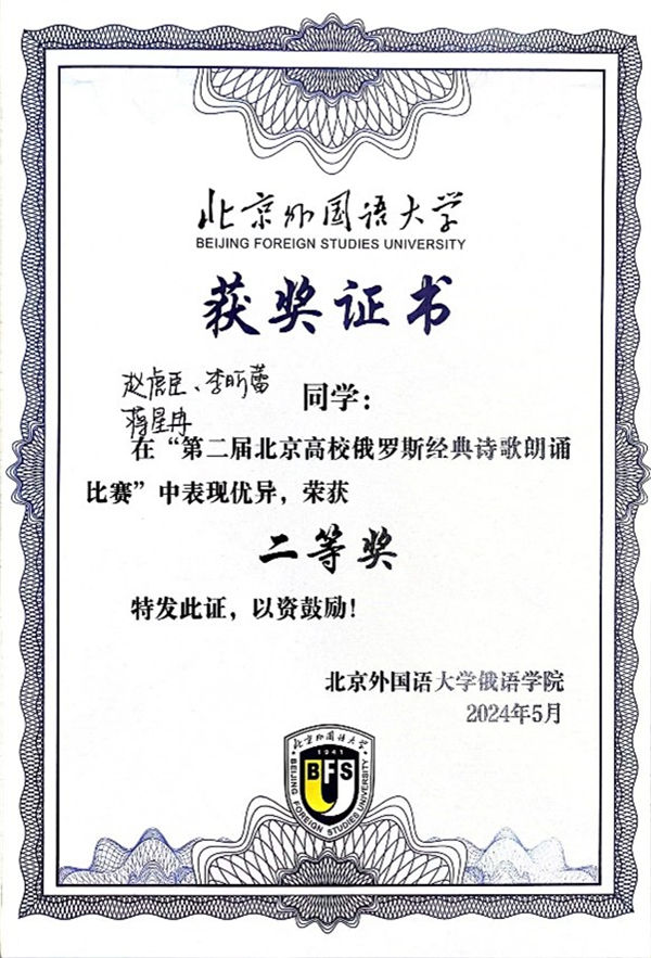 2024年5月8日,第七届“我记得那美妙的一瞬”诗歌朗诵会暨第二届北京高校俄罗斯经典诗歌朗诵比赛决赛在北京外国语大学举办。北京大学俄语系本科生王可懿(2022级)、倪筱玥(2022级)、韩翰林(2022级)以及赵虎臣(2023级)、李昕蕾(2023级)、蒋星冉(2023级)分别组队参赛。