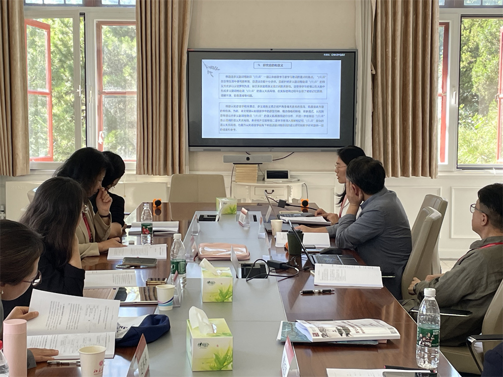 “语言、教育研究”分论坛由北京大学文丽华老师和丁一老师先后担任主持,上海外国语大学高陆洋老师和复旦大学郭一诚老师先后进行评议并组织讨论。复旦大学郭一诚老师以《功能汉字词在韩语语法系统中的演化》为题发言,探讨了功能汉字词在韩语语法系统中的作用,并且深入分析了功能汉字词在韩语语法系统中的演化。国防科技大学于美灵老师以《韩国语多义副词格助词“(으)로”的语义拓展路径研究》为题发言,对韩国语多义副词格助词“(으)로”语义进行了较全面的分类,并对其语义认知进行了深入分析,最后探索了“(으)로”的语义拓展路径。四川外国语大学曹文凯老师以《韩国语句中边界音节的语调特征》为题发言,聚焦于韩国语句中边界音节的语调,通过语音实验,证明了韩国语句中语调短句末尾音节有“长音化”现象,并且演讲形式话语中句中语调共有四种调型。上海外国语大学博士研究生单清丛以《韩汉语使动表达的非典型反预期语义实现及其多语验证——以韩语长短使动与汉语隔开式使动为例》为题发言,分析了韩国语与汉语直接使动与间接使动的非典型反预期语义实现,并且用维吾尔语、泰语等语言对使动表达非典型反预期语义实现从正反面进行了多语言验证。上海外国语大学高陆洋老师以《语言,大众文化,意识形态——从<平壤文化语保护法>说起》为题发言,分析了《平壤文化语保护法》的立法背景与特殊性,强调清晰认识语言传播和大众文化意识形态的建构效应,倡导理性认识朝鲜并关注朝鲜课题。中国传媒大学范柳老师以《中华文化传播背景下的典籍翻译策略——以<论语>韩译为例》为题发言,对《论语》韩译本翻译策略进行了对比,分析并总结了中华文化传播背景下的典籍翻译策略与方法,表达了对中华文化更好走出去的期待。天津外国语大学迟琳琳老师以《韩国语名词性从句包孕复句构式教学方案》为题发言,阐述了基于构式的名词性从句包孕复句教学的必要性,从导入、输入展示、加工吸收和语用输出四个环节探究了教学方案,强调了教学指导对复杂句学习的重要性与意义。北京大学博士后张磊以《语言规划视角下的韩国语词典编纂政策研究》为题发言,立足词典并且利用文献分析法,分别在语言本体规划与语言习得与声望规划下梳理了韩国语词典编纂政策,总结了韩国语词典编纂的特点并提出了一些关于未来汉语词典编纂的期待。